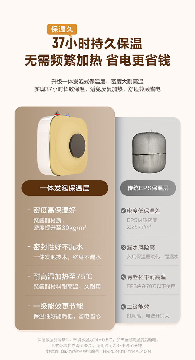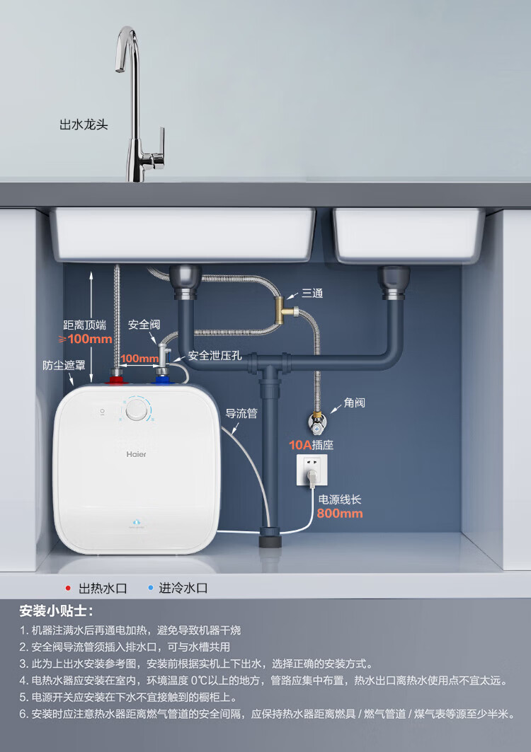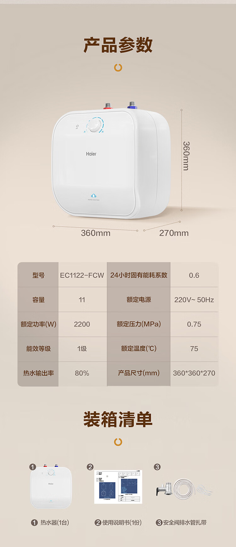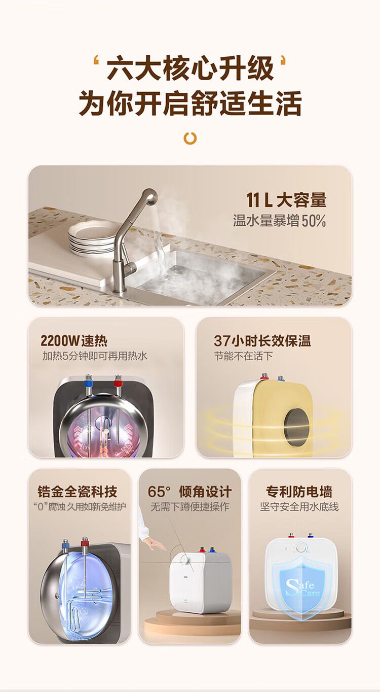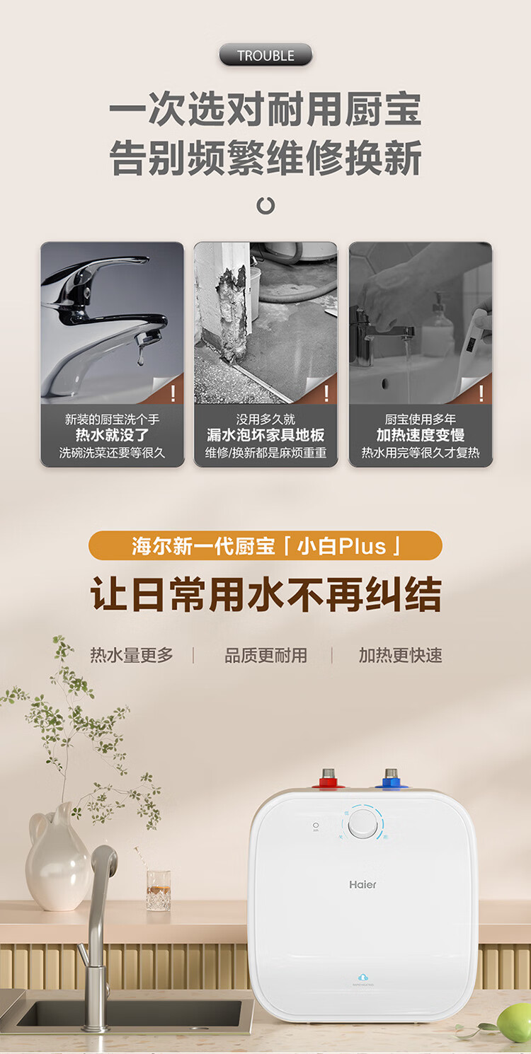 • 商品名称:海尔(Haier)11升小厨宝电热水器FCW 金刚无缝胆 一级能效节能2200W速热储水式家用厨房台下小型热水宝 EC1122-FCW/台