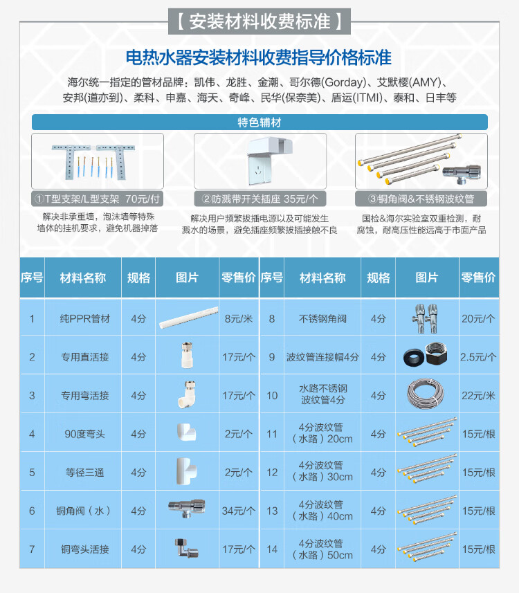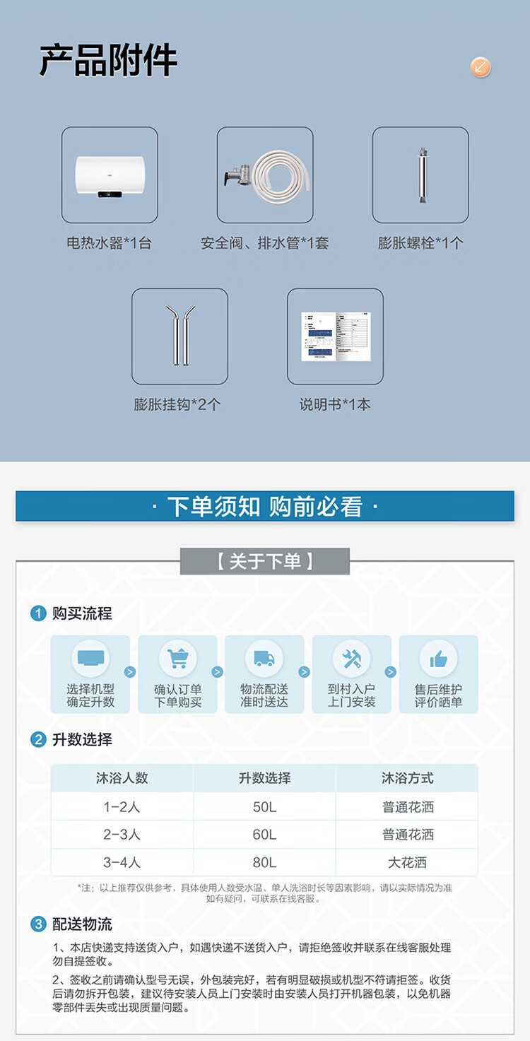 包装清单: 电热水器*1台、安全阀、排水管*1套、膨胀螺栓*1个、膨胀挂钩*2个、说明书*1个