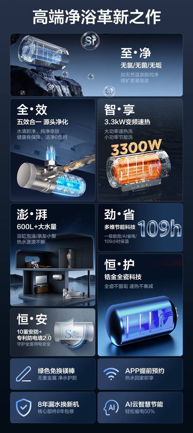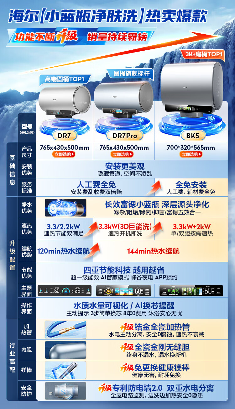 商品名称: 海尔(Haier)麦浪套系电热水器 80升DR7 富锶小蓝瓶净肤洗 3300W变频一级能效节能 速热大水量家用 EC8002H-DR7AU1/台