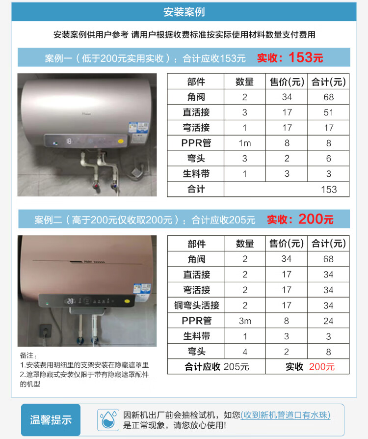包装清单: 电热水器*1台、安全阀排水管*1套、说明书*1本、膨胀挂钩*2个、膨胀螺栓*1个