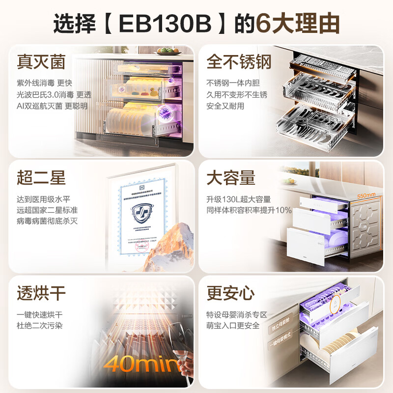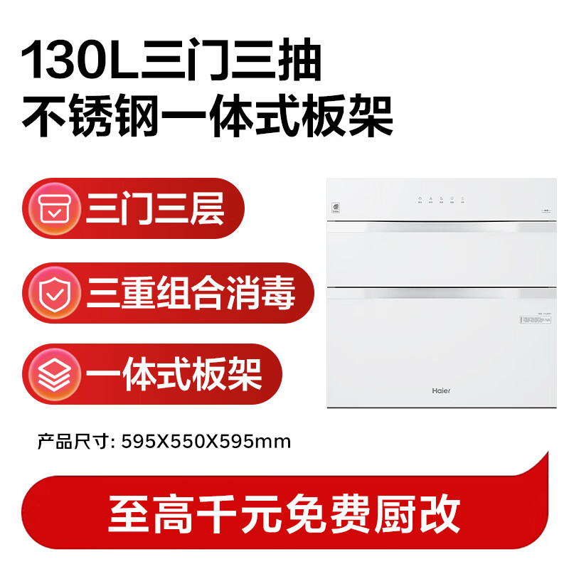 家用电器  > 厨卫大电  > 消毒柜  >  海尔/Haier  >  海尔(Haier)130L【小红花厨电-绽放版】嵌入式消毒柜 灭菌舱系列大容量消毒碗柜三门三抽 白色母婴级 EB130B ZQD130F-EB130B/台