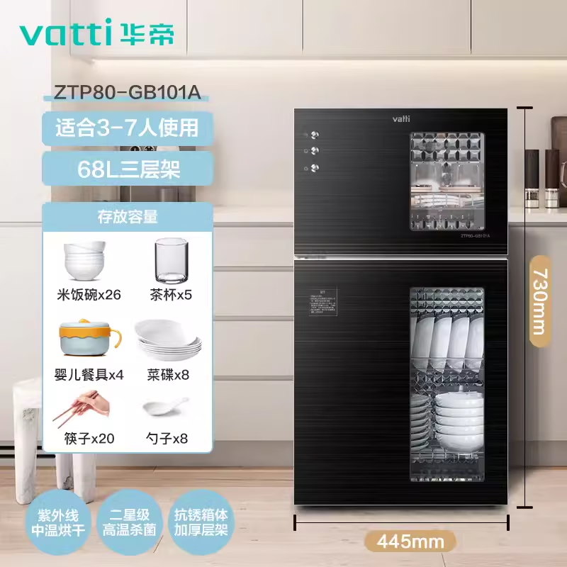 • 商品名称:华帝(VATTI)家用消毒柜立式小型紫外线高温烘干餐具奶瓶两用消毒碗柜 ZTP80-GB101A ZTP80-GB101A/台