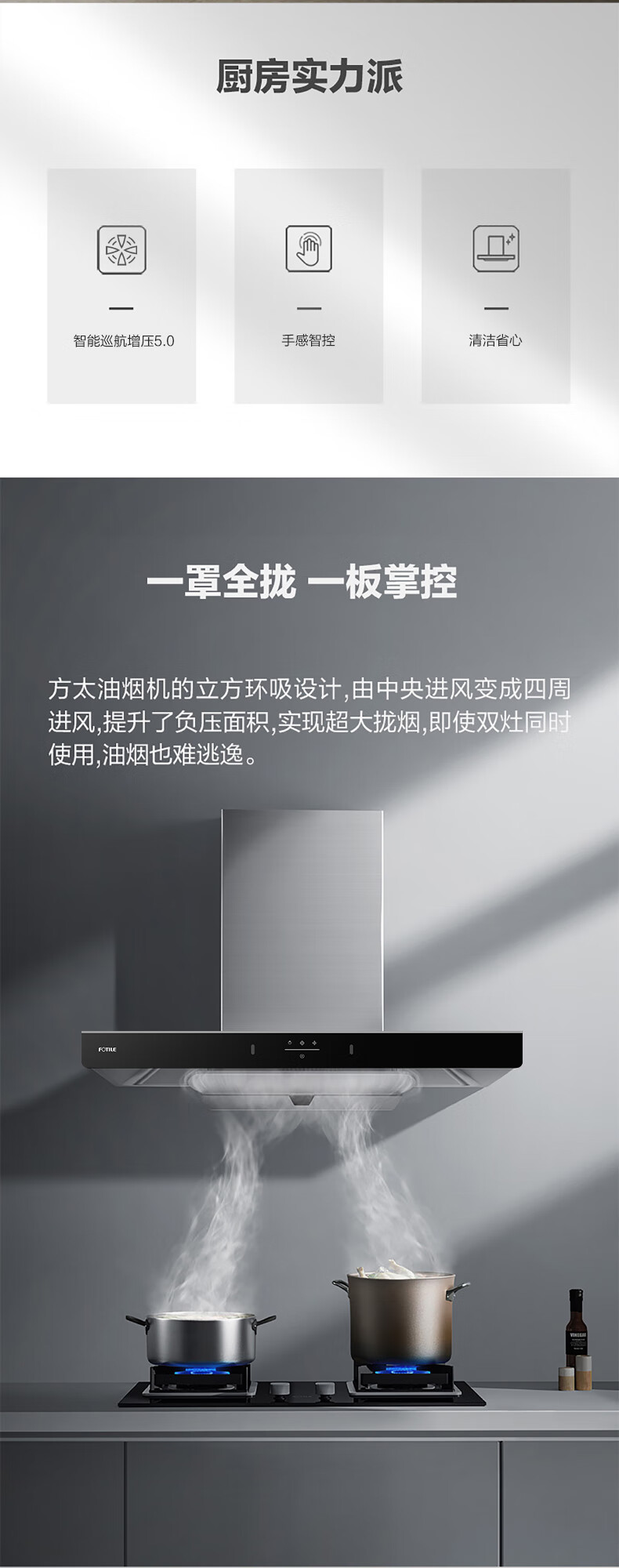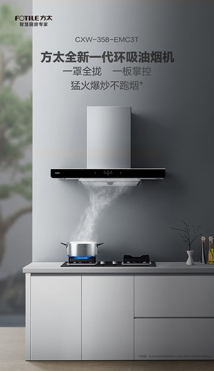 • 商品名称:方太(FOTILE)EMC3T 家用抽油烟机 欧式 22立方瞬吸风 980Pa大静压 挥手智控 CXW-358-EMC3T/个