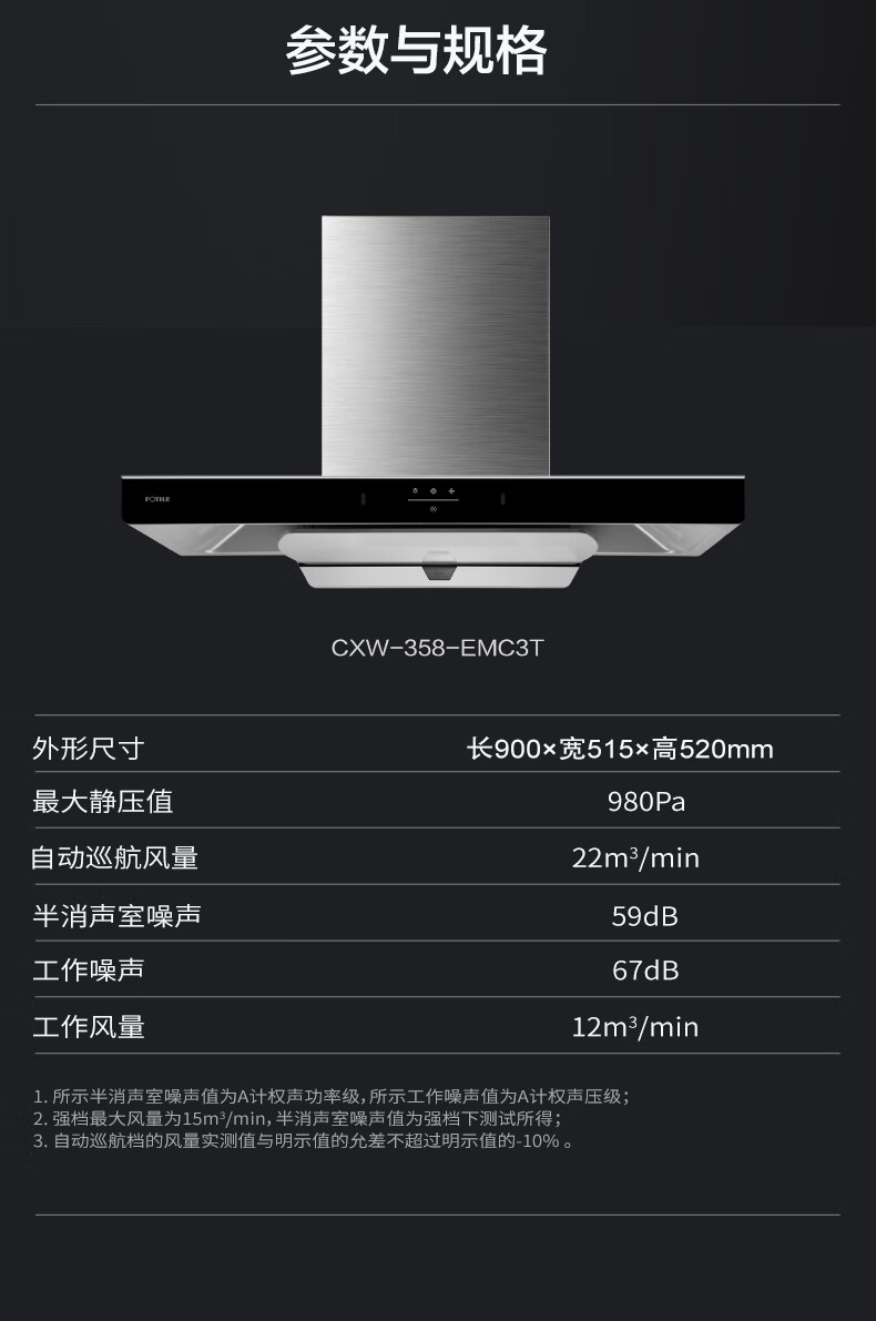 商品名称: 方太(FOTILE)EMC3T 家用抽油烟机 欧式 22立方瞬吸风 980Pa大静压 挥手智控 CXW-358-EMC3T/个