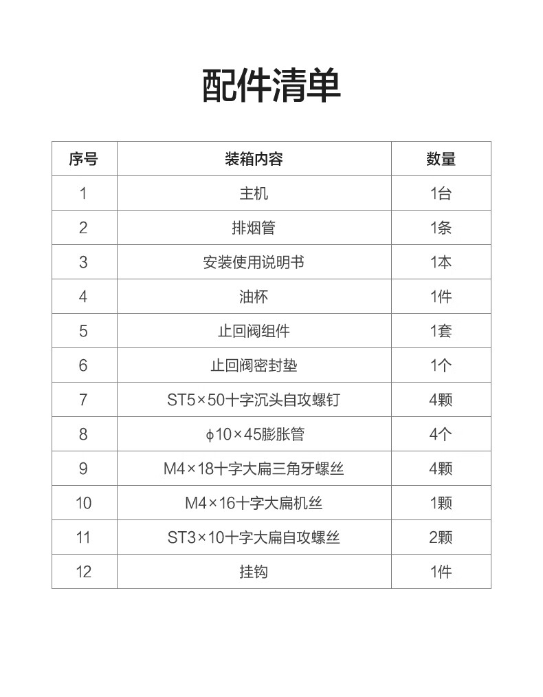 包装清单: 主机1台 排烟管1条安装使用说明书1本油杯1件止回阀组件1套止回阀密封垫1个ST5×50十字沉头自攻螺钉4颗 φ10×45膨胀管4个M4×18十字大扁三角牙螺丝4颗 M4×16十字大扁机丝1颗ST3×10十字大扁自攻螺丝2颗挂钩1件