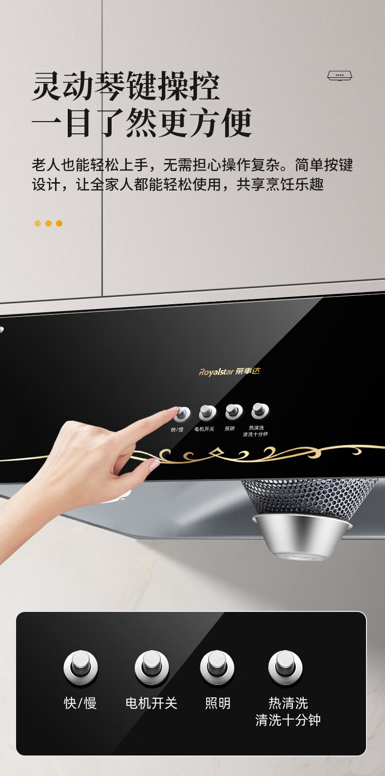 商品名称: 荣事达 大吸力中式油烟机免拆洗脱排油烟机顶吸式排烟机 (不含安装)鎏金面板+机械按键热清洁X10 CXW-268-C621/套