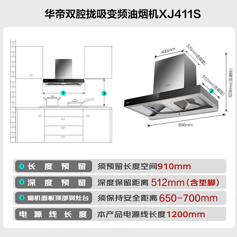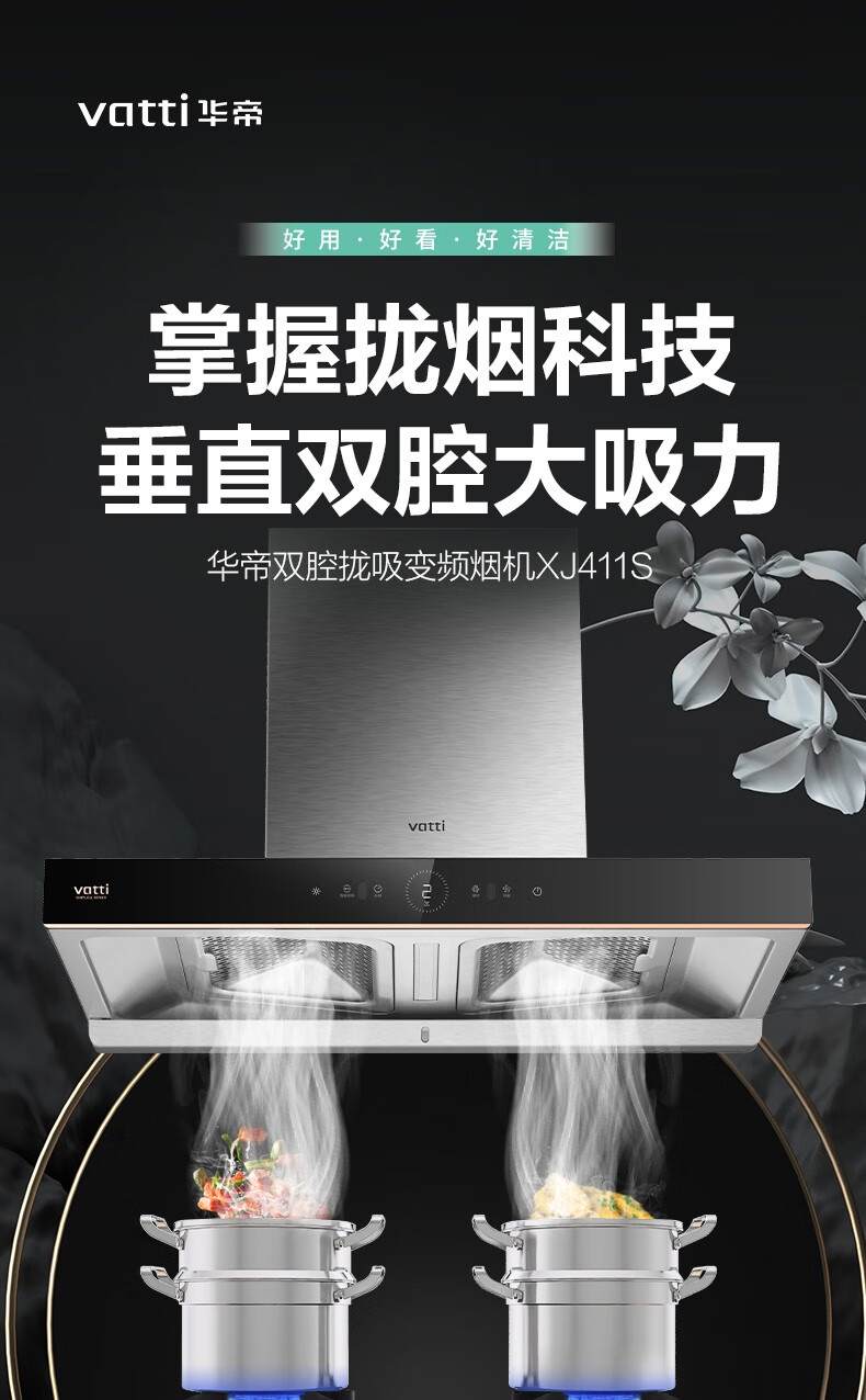 • 商品名称:华帝CXW-200-XJ411S双腔拢吸1000Pa大静压25m³吸力烟灶联动三重负压挥手智控一级能效顶吸油烟机 CXW-200-XJ411S/台