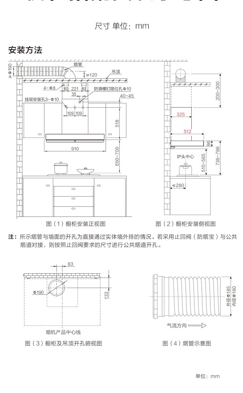 包装清单: 吸油烟机*1台 烟管组件*1套 挂架*1件 油杯*1件 沉头木螺钉5×80*4颗 Φ10塑料胀管*4颗 垫脚*2个 安装使用说明书*1本 出厂编号*1张