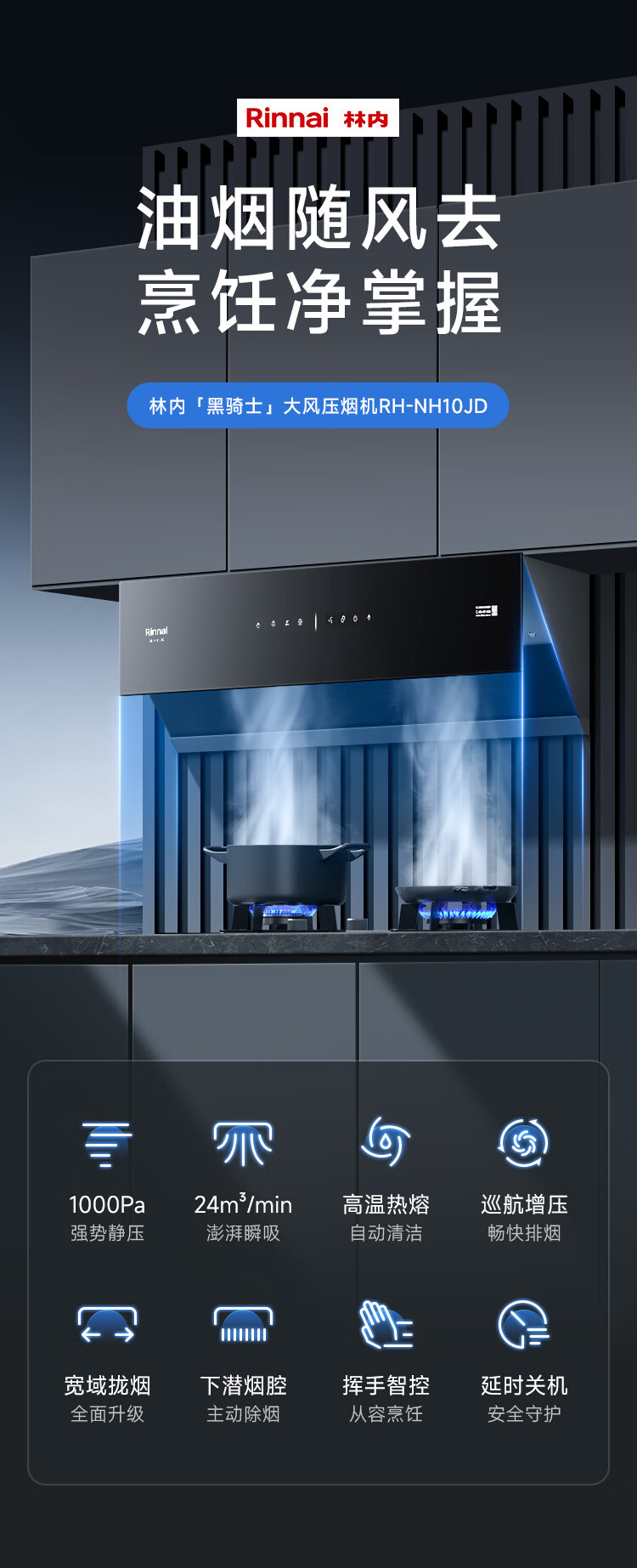 • 商品名称:林内(Rinnai)【黑骑士】抽油烟机灶具侧吸式家用烟灶套装自清洁24双循环大风量大火力灶具10JD+07M【套装商品】 CXW-188-NH10JD/台