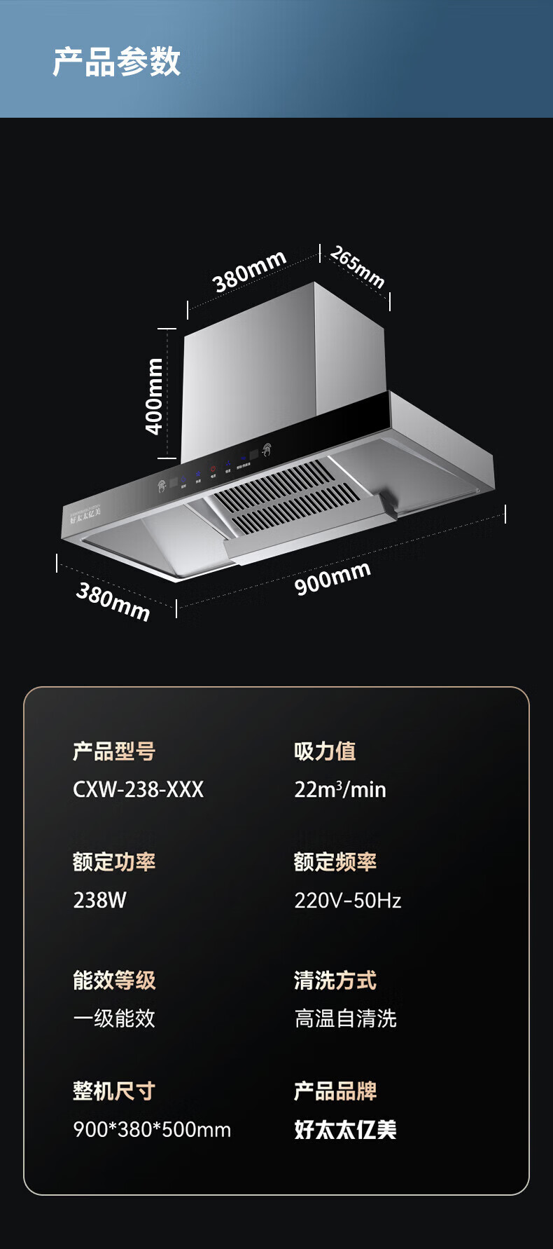 • 商品名称:好太太亿美油烟机家用欧式顶吸式抽油烟机厨房吸油烟机大吸力 900五键清洗一级能效 CXW-238-809DT2 CXW-238-809DT2/台
