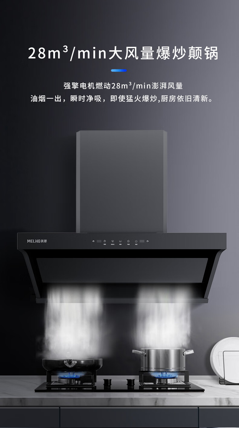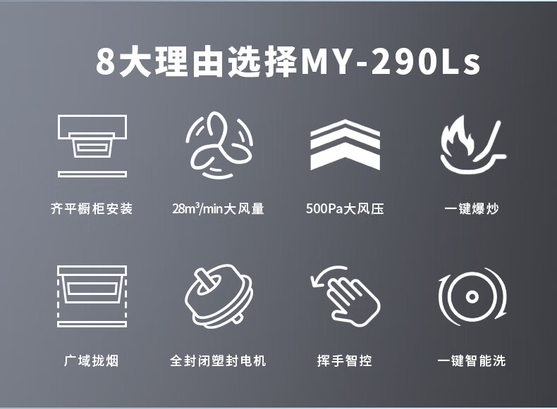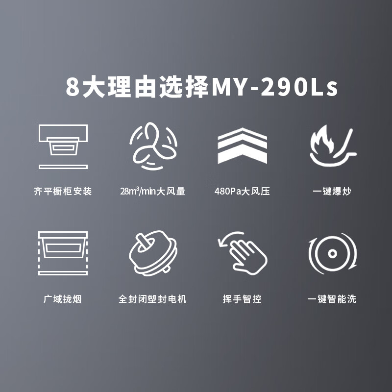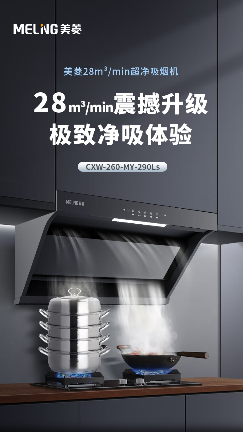 家用电器  > 厨卫大电  > 油烟机  >  美菱/MeLng  >  美菱28m³超大吸力 齐平橱柜安装 挥手智控 全封闭塑封电机 顶侧双吸油烟机MY-290Ls CXW-260-MY-290Ls/台