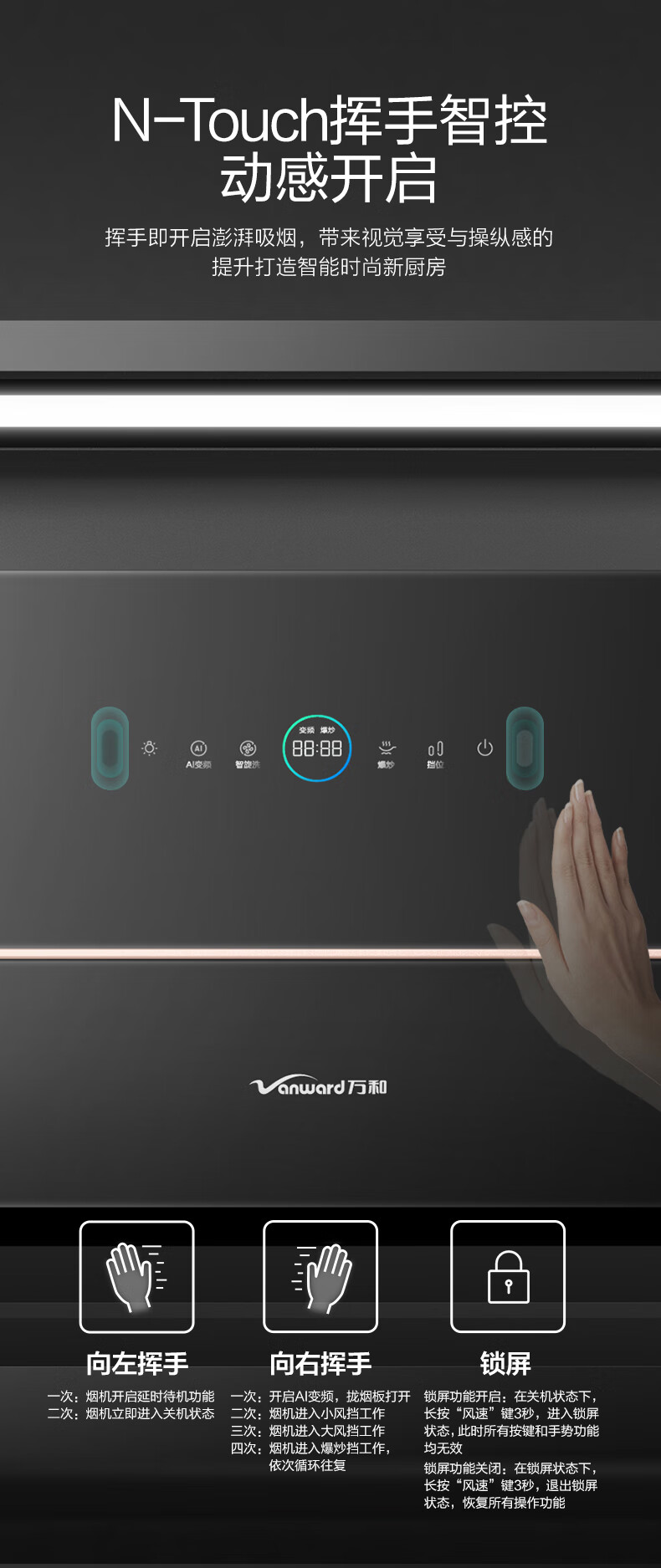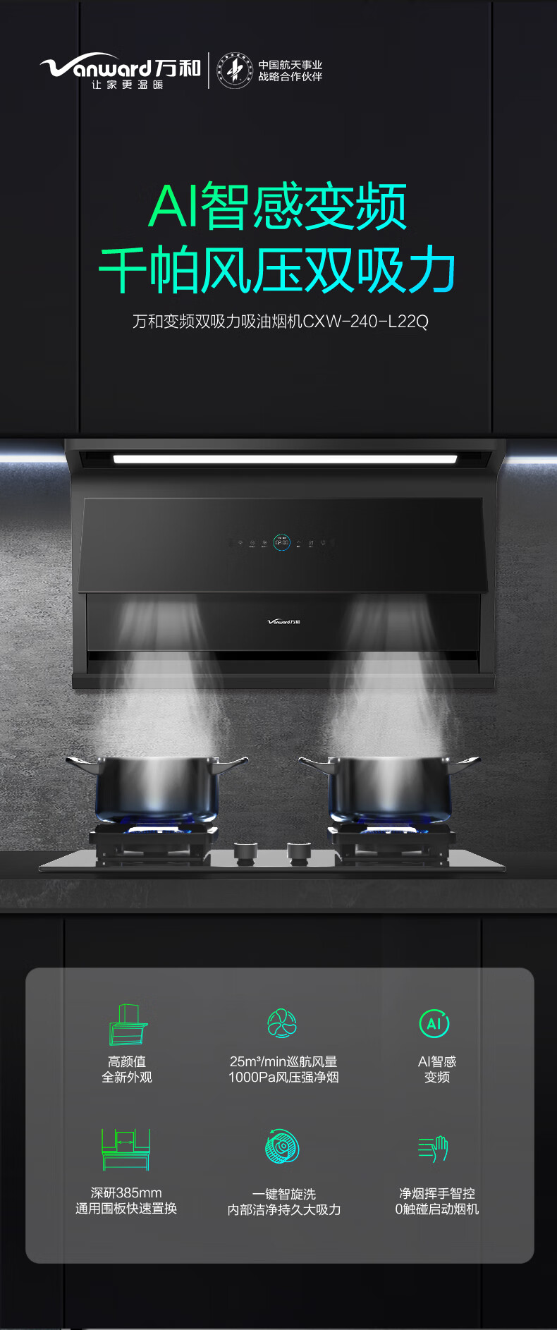 • 商品名称:万和【双吸力】L22Q 顶侧双吸油烟机 25立方飓风大吸力 挥手感应 自清洗 延时关机 CXW-240-L22Q/台
