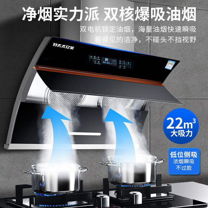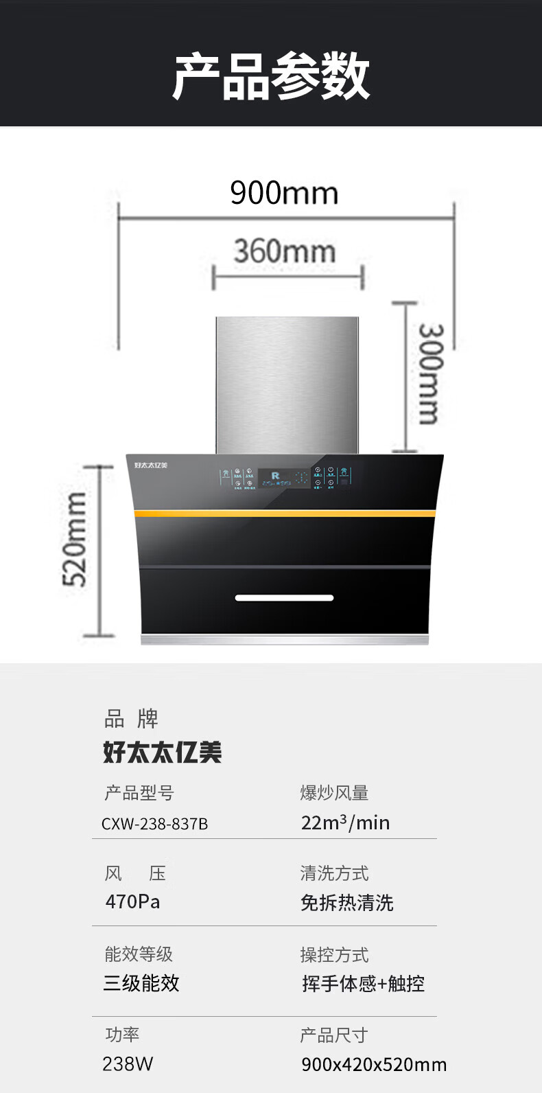 • 商品名称:好太太亿美油烟机家用侧吸式抽油烟机双电机旗舰款大开合 大吸力CXW-238-837B CXW-238-837B/台