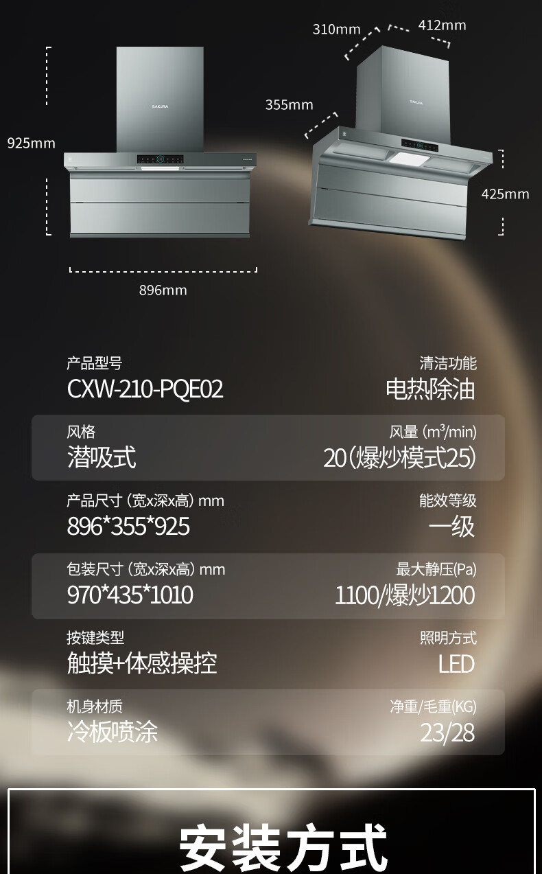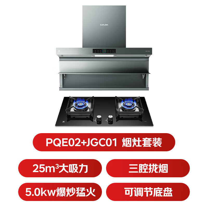 家用电器  > 厨卫大电  > 油烟机  >  樱花/SAKURA  >  樱花(SAKURA)烟灶套顶侧三腔多维拢烟25m³/min大风量变频增压5.0KW全铜火盖灶PQE02+JGC01天然气【套装商品】 CXW-210-PQE02/台