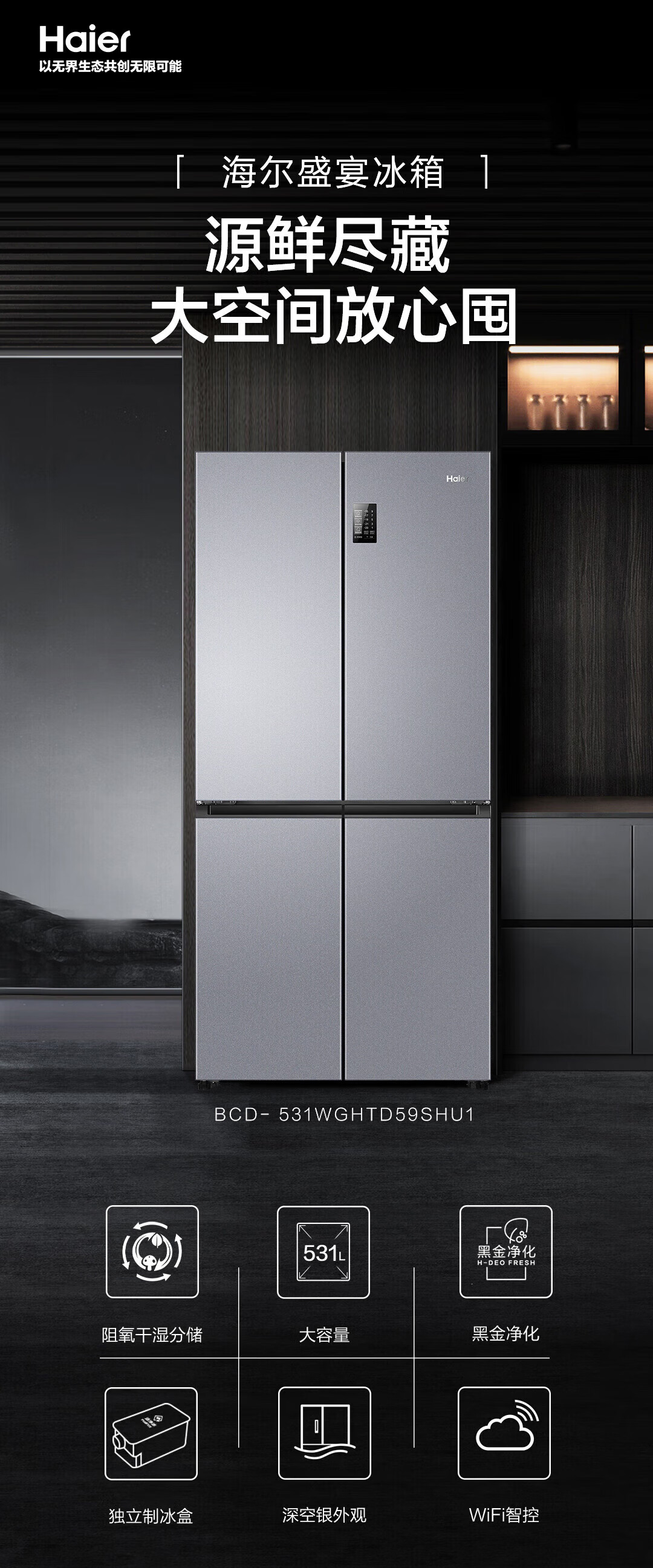 家用电器  > 大家电  > 冰箱  >  海尔/Haier  >  海尔(Haier)531升十字对开四开门家用电冰箱制冰风冷无霜一级能效变频节能家电BCD-531WGHTD59SHU1 BCD-531WGHTD59SHU1/台