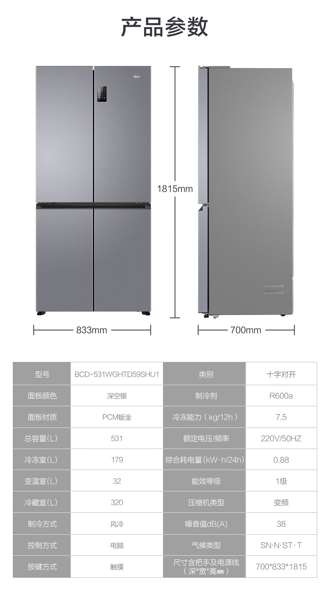 • 商品名称:海尔(Haier)531升十字对开四开门家用电冰箱制冰风冷无霜一级能效变频节能家电BCD-531WGHTD59SHU1 BCD-531WGHTD59SHU1/台