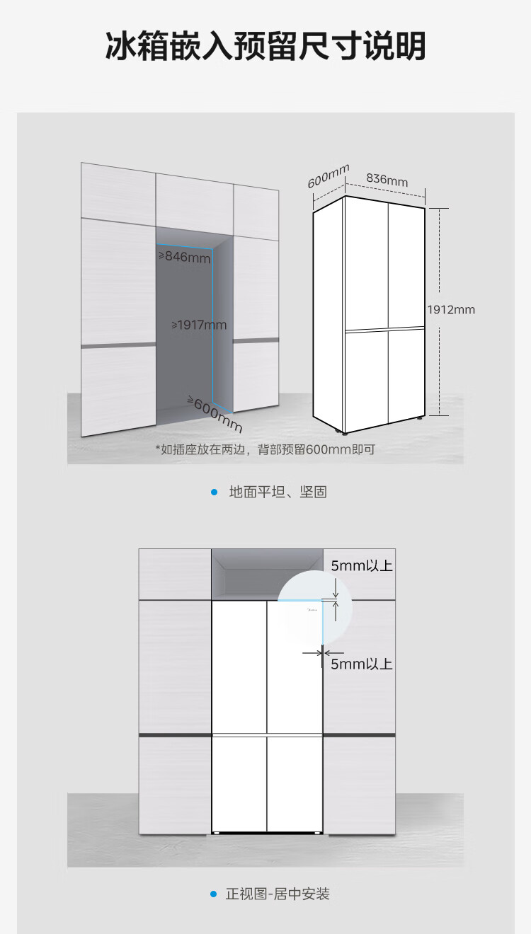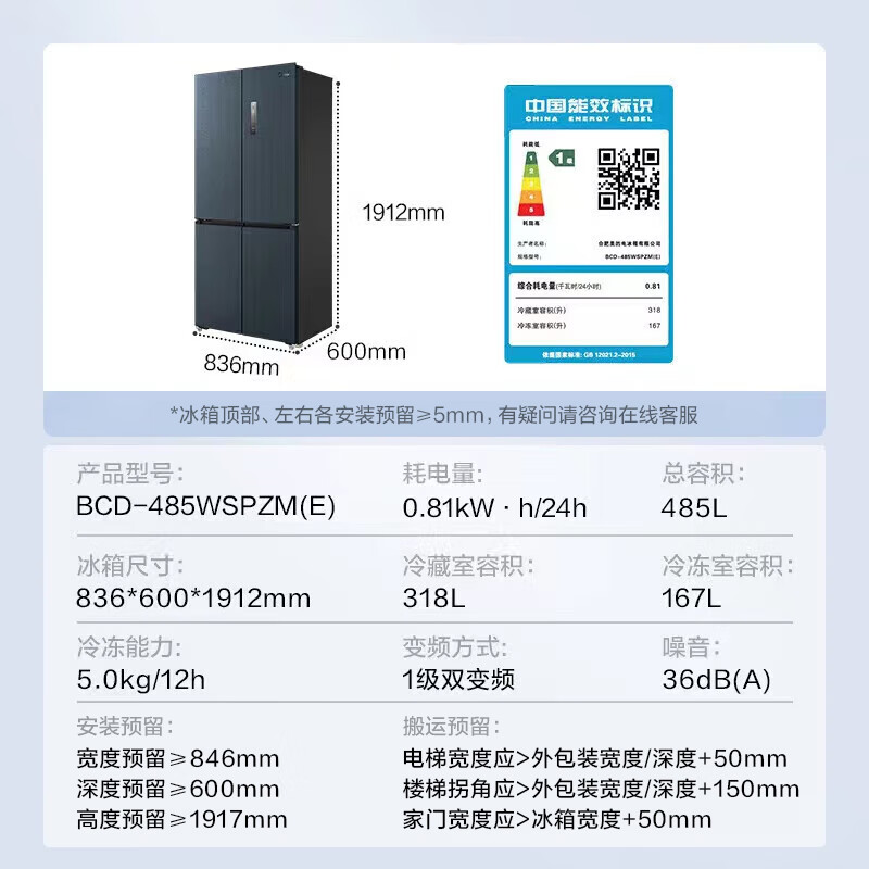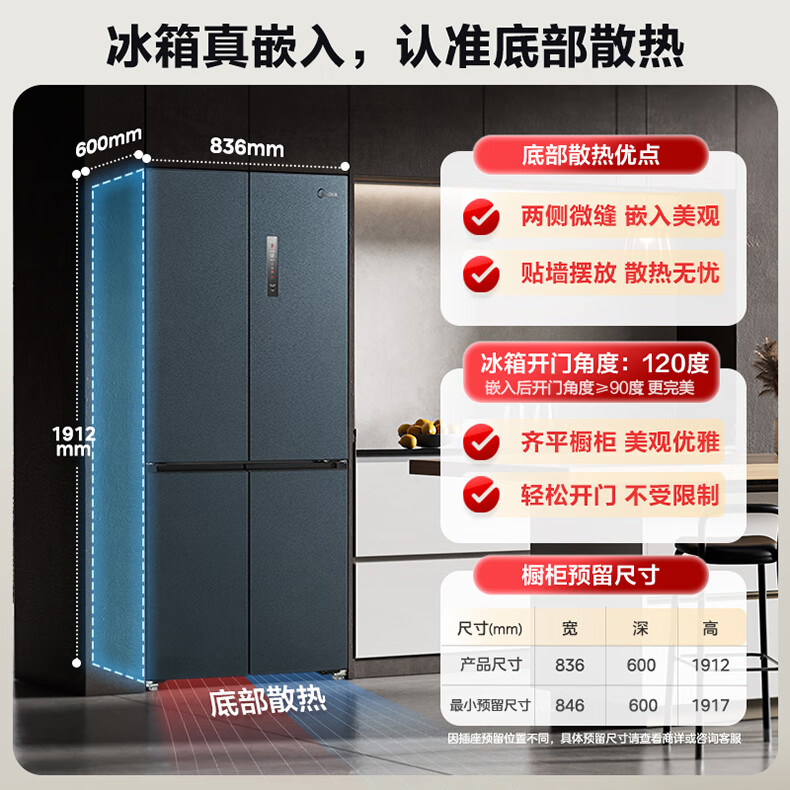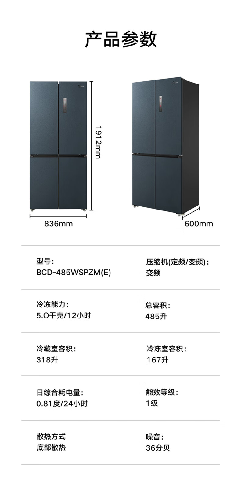 • 商品名称:美的(Midea)485L十字门冰箱60厘米纯平全嵌全空间养鲜一级能效风冷无霜底部散热BCD-485WSPZM(E) BCD-485WSPZM(E)/台