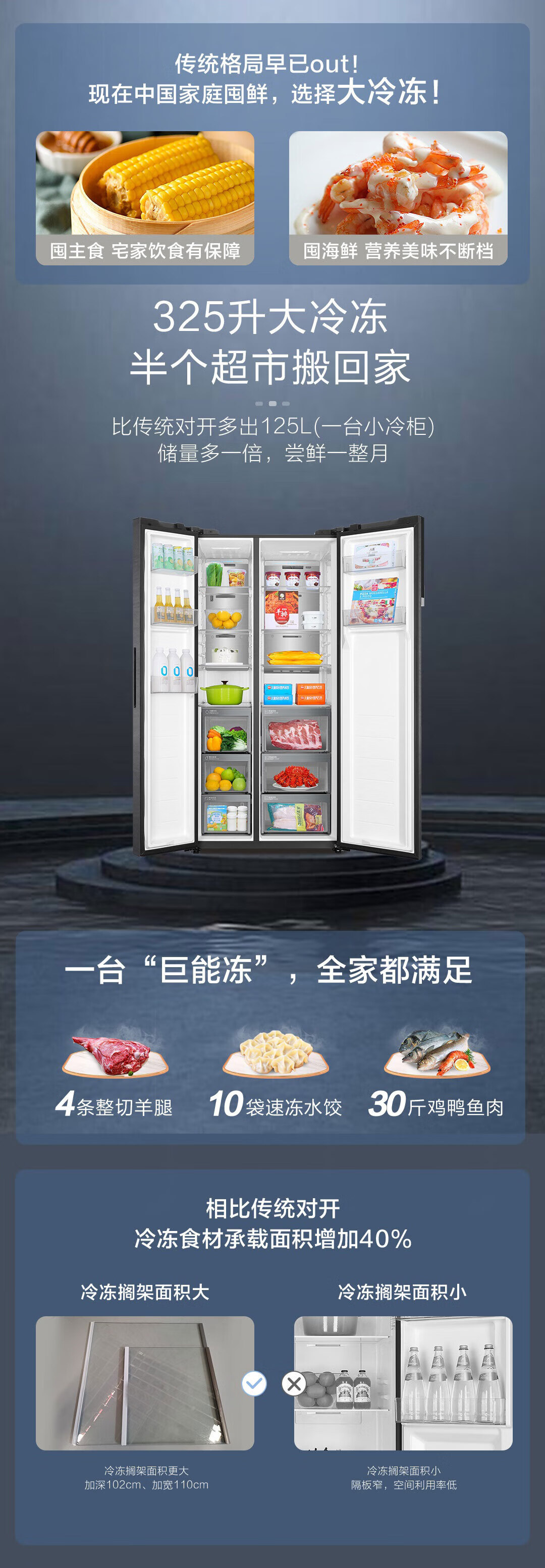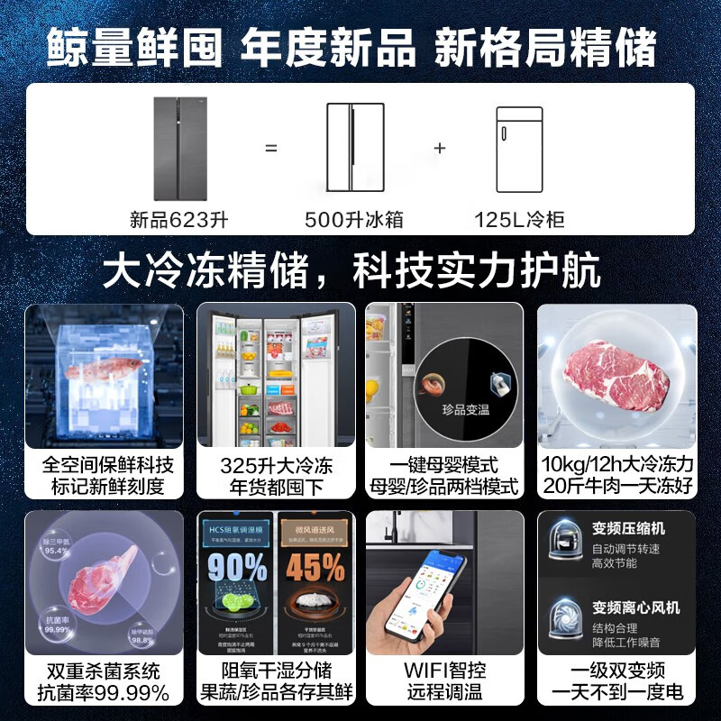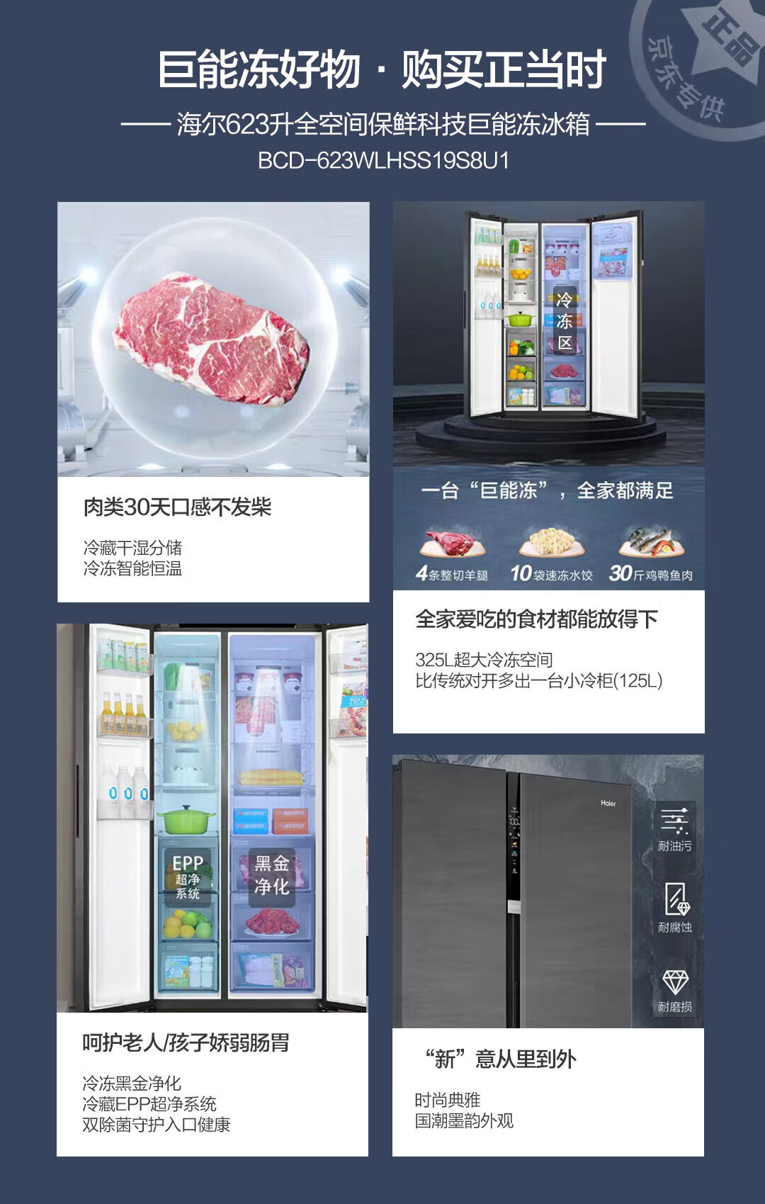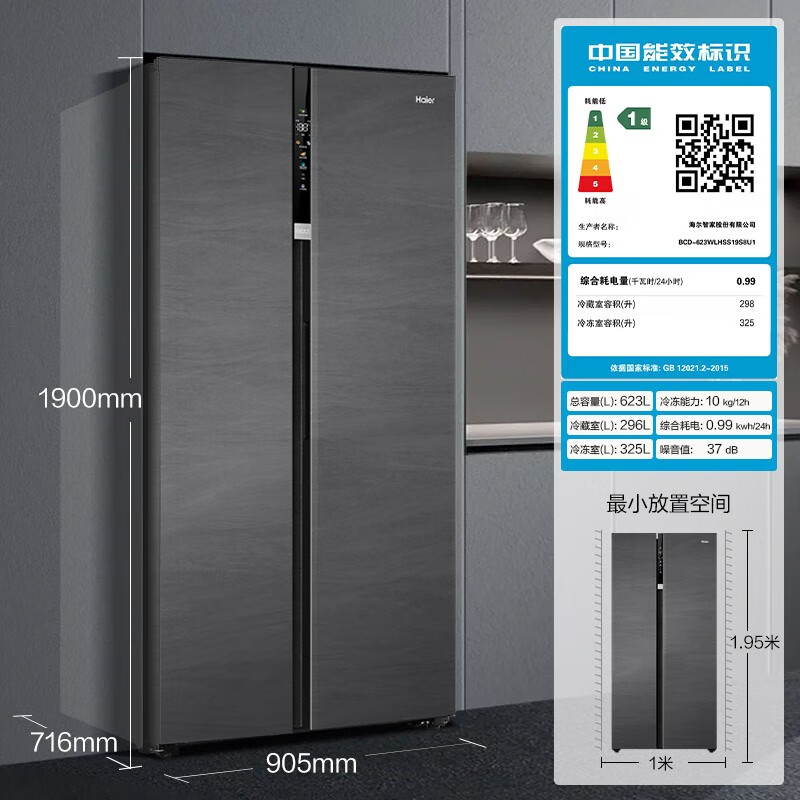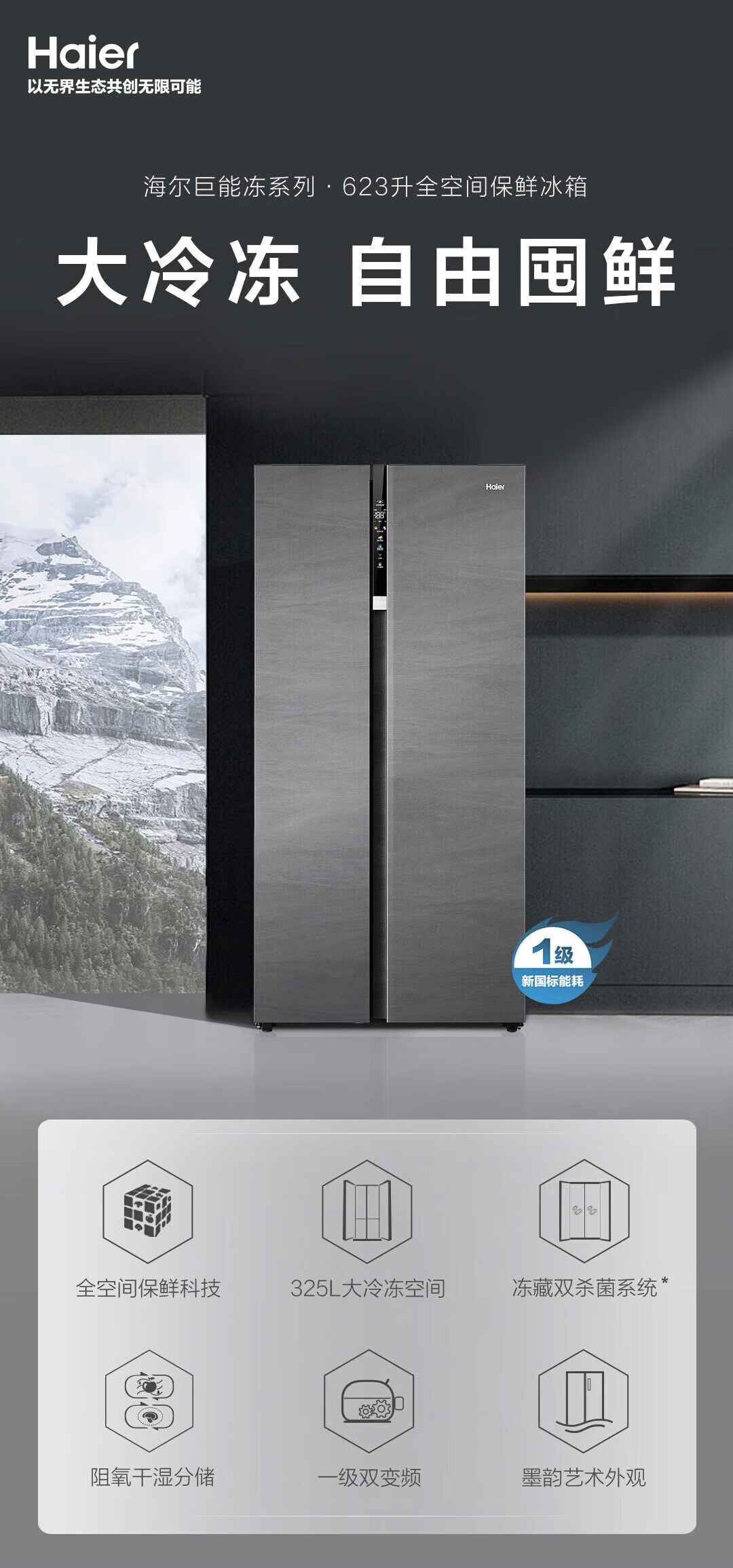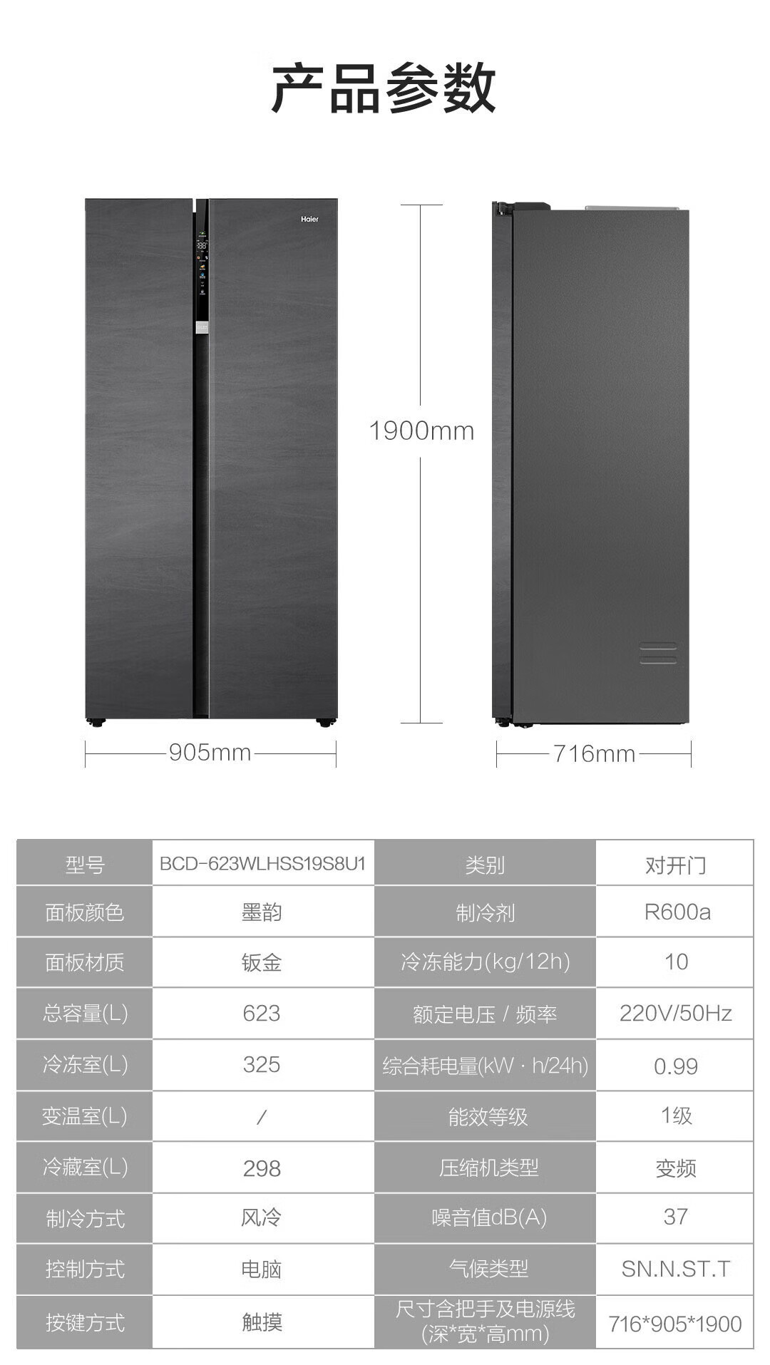 商品名称: 海尔(Haier)对开双开门冰箱 大冷冻变频一级能效 全空间保鲜净味 623升超大容量电冰箱 BCD-623WLHSS19S8U1 BCD-623WLHSS19S8U1/台