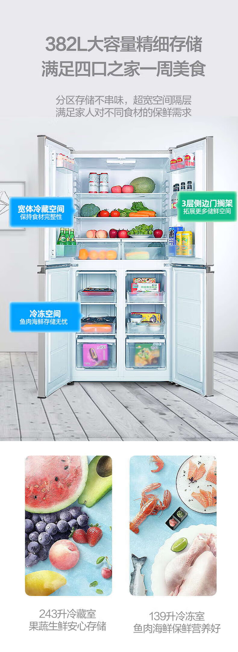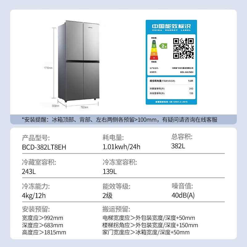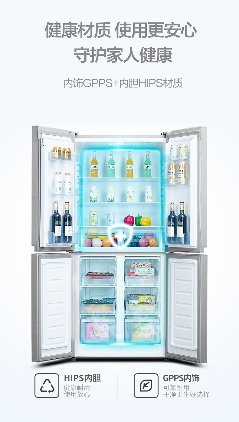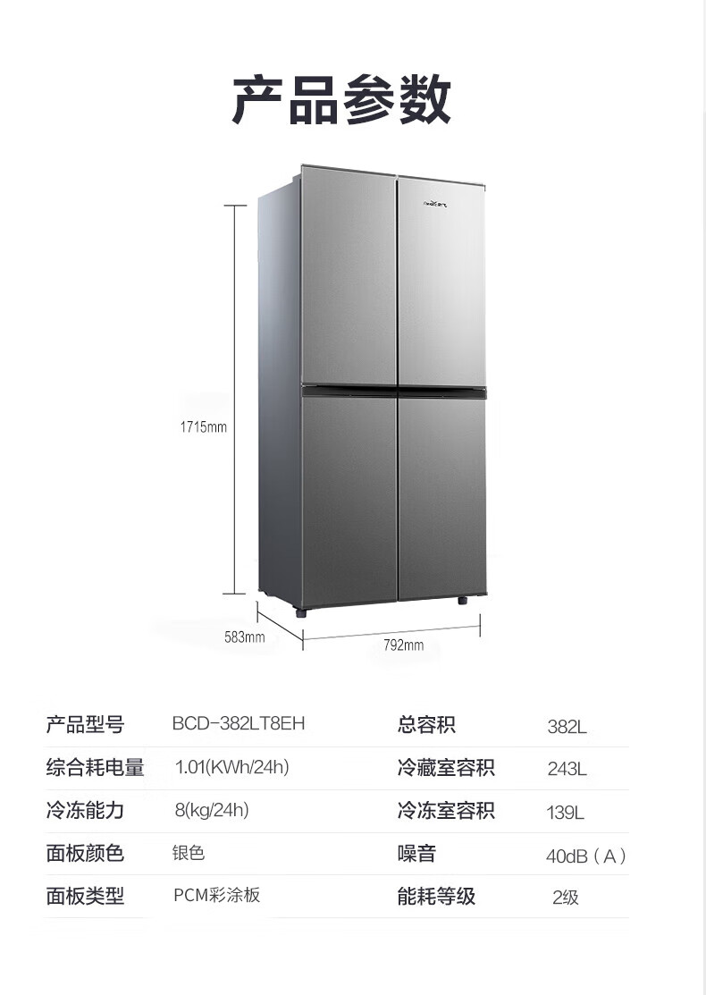 • 商品名称:新飞 (Frestec)382L十字门精细储鲜均匀制冷健康材质一体照明冰箱BCD-382LT8EH BCD-382LT8EH/台