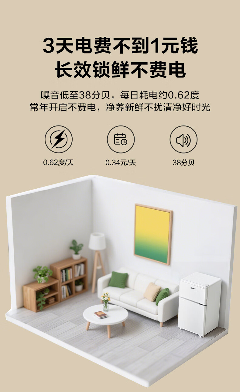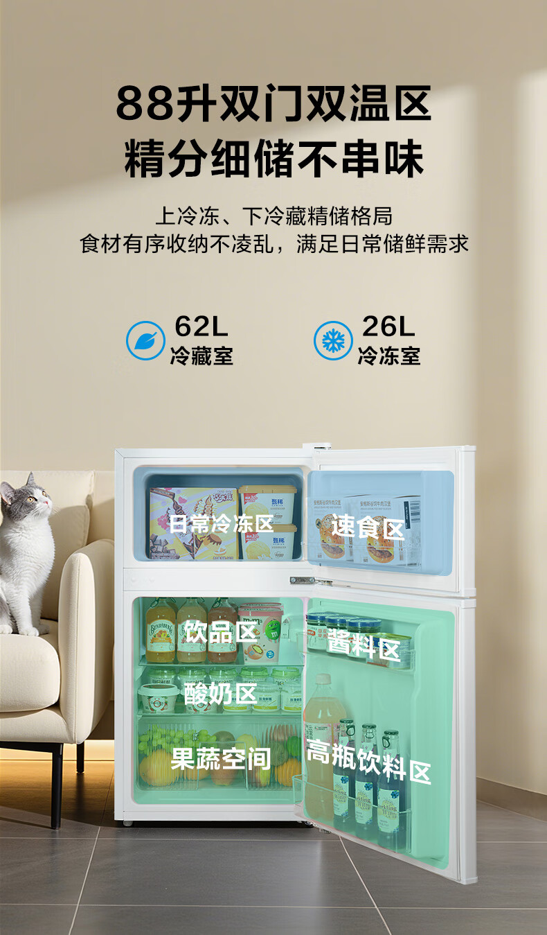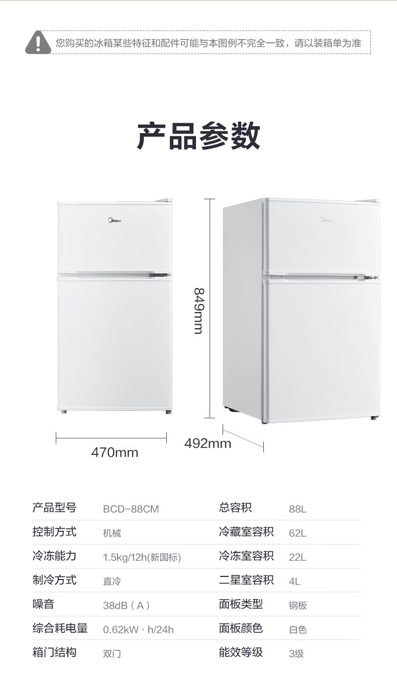 • 商品名称:美的(Midea)88L两门小冰箱白色迷你冰箱租房宿舍办公室小型家用双温可冷冻冷藏节能BCD-88CM BCD-88CM/台