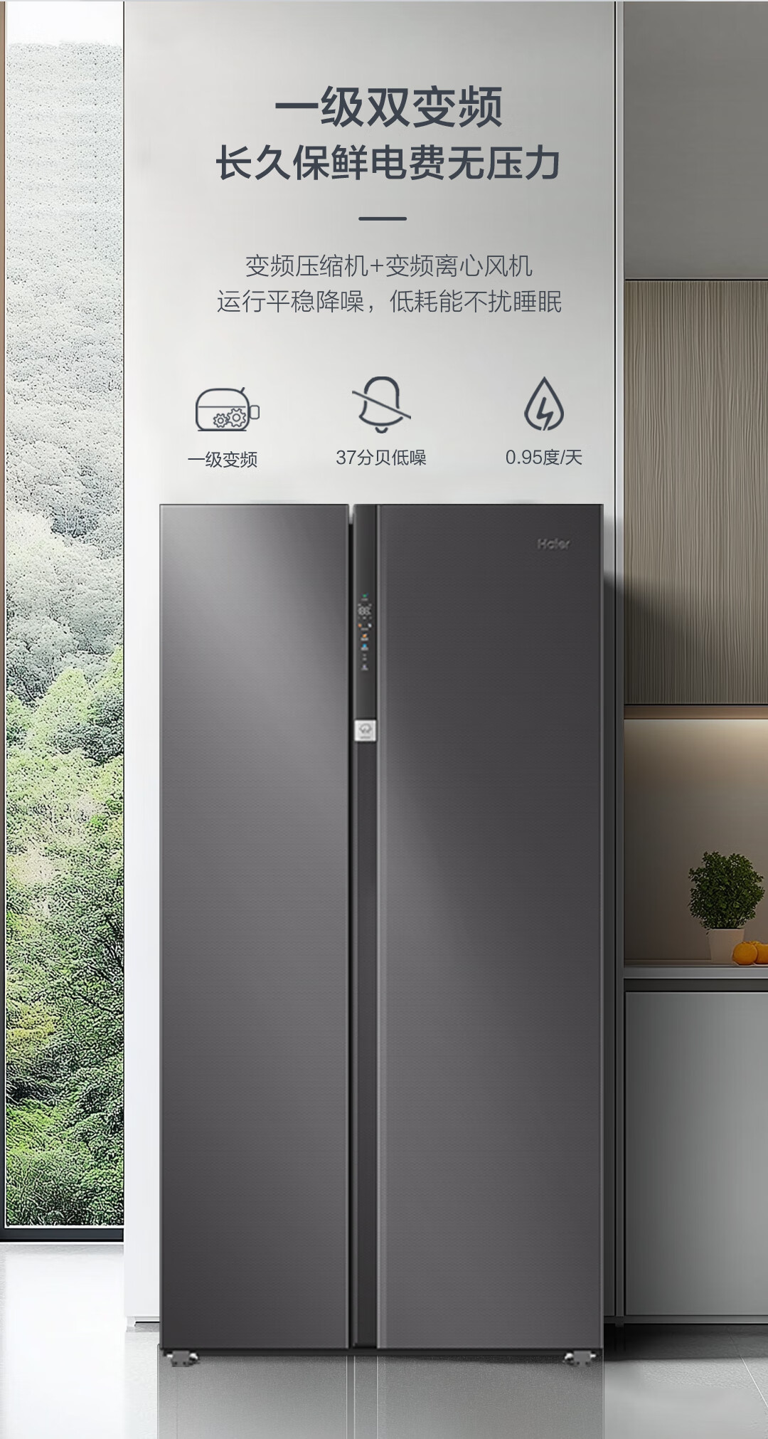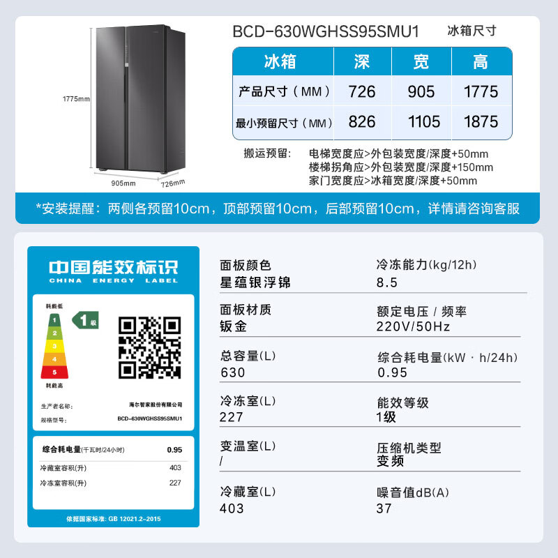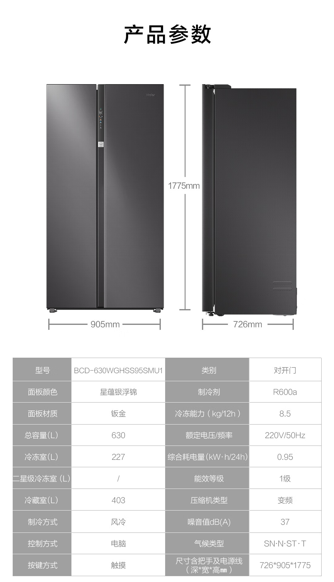 • 商品名称:海尔(Haier)盛宴630L对开门冰箱干湿分储一级能效风冷变频超大容量灰色BCD-630WGHSS95SMU1 BCD-630WGHSS95SMU1/台