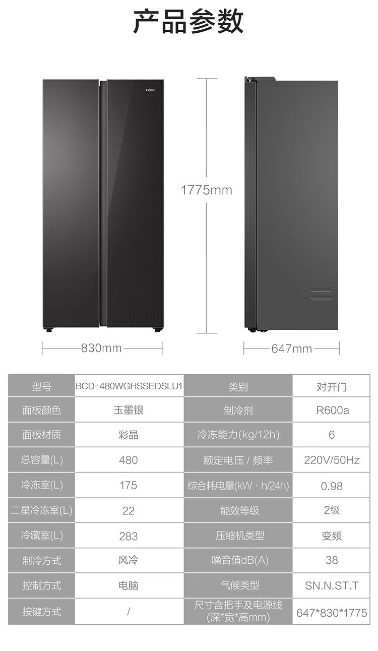 • 商品名称:海尔(Haier)480升对开门风冷无霜彩晶变频大容量超薄家用电冰箱BCD-480WGHSSEDSLU1 BCD-480WGHSSEDSLU1/台