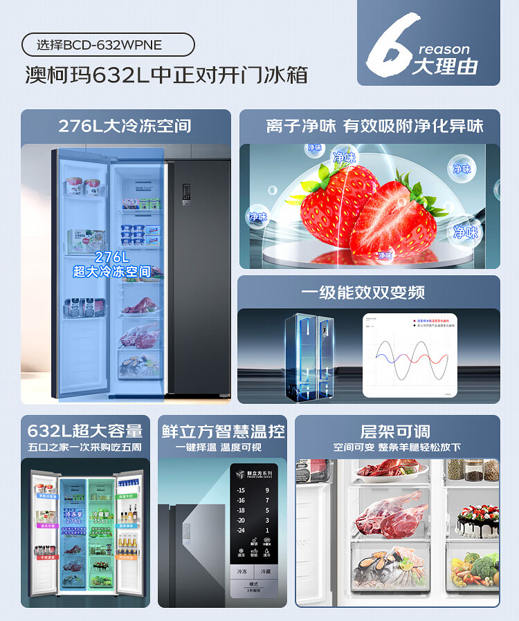 • 商品名称:澳柯玛(AUCMA)632升双开门对开门家用大容量囤货电冰箱风冷无霜一级能效双变频节能低噪BCD-632WPNE BCD-632WPNE/台