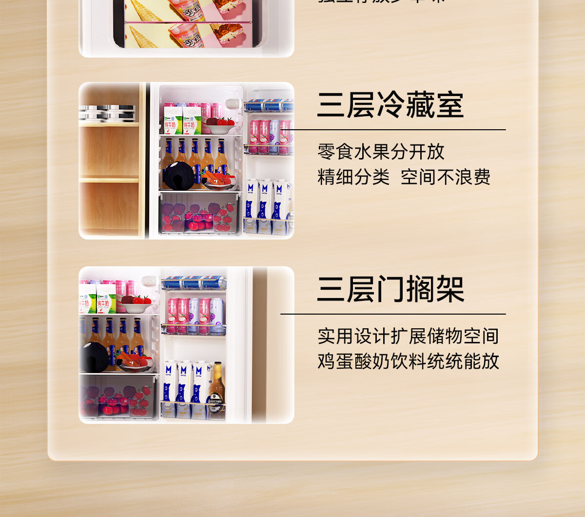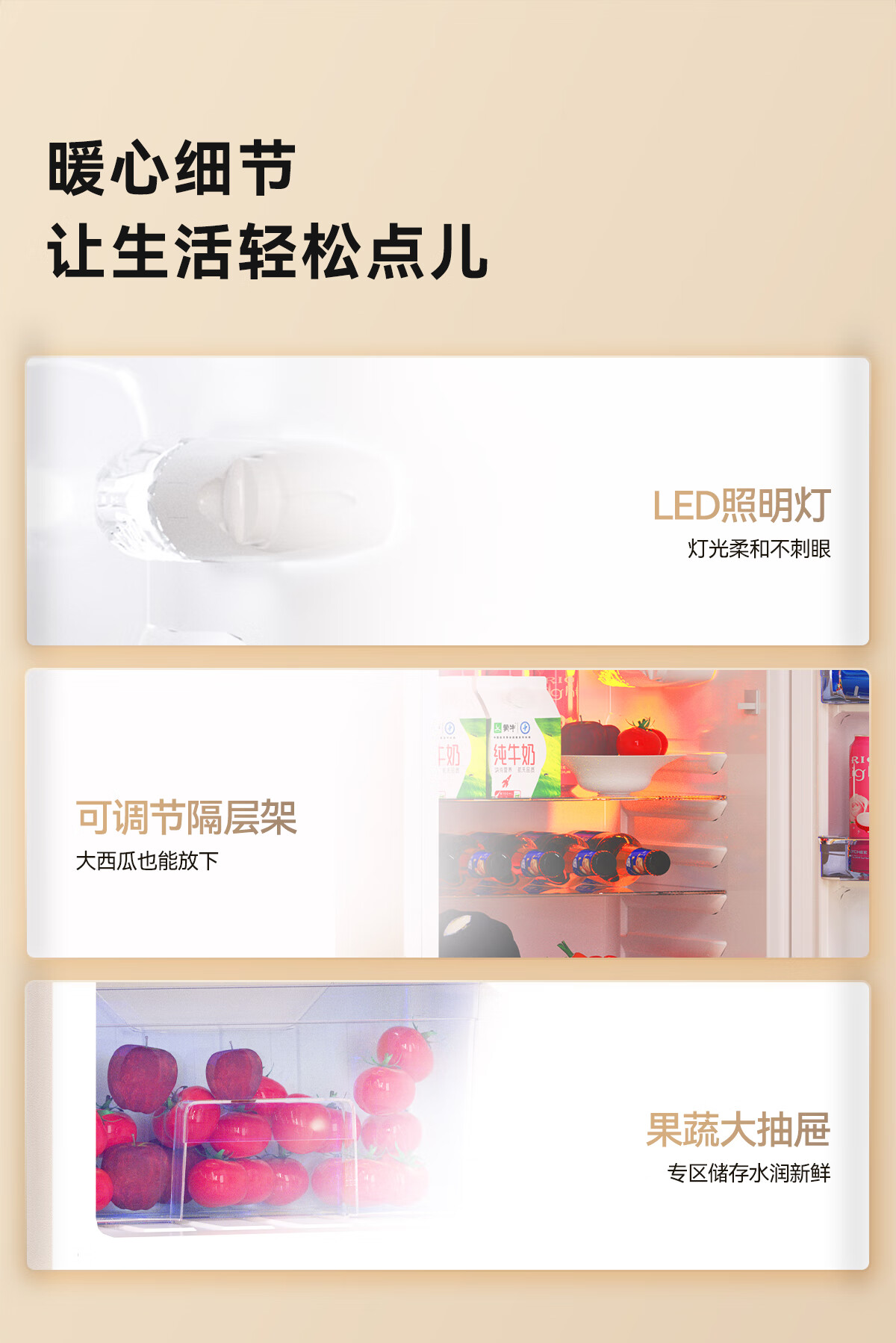 包装清单: 用户使用手册*1 合格证*1 保修卡*1 冰锥*1 果菜盒*1 瓶架*3 搁架*4