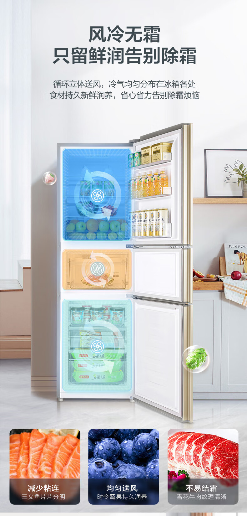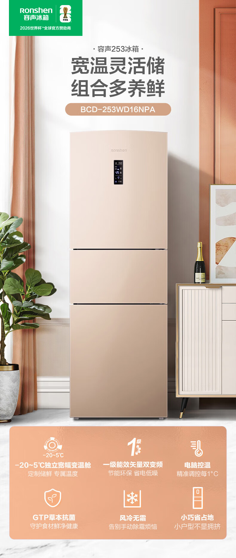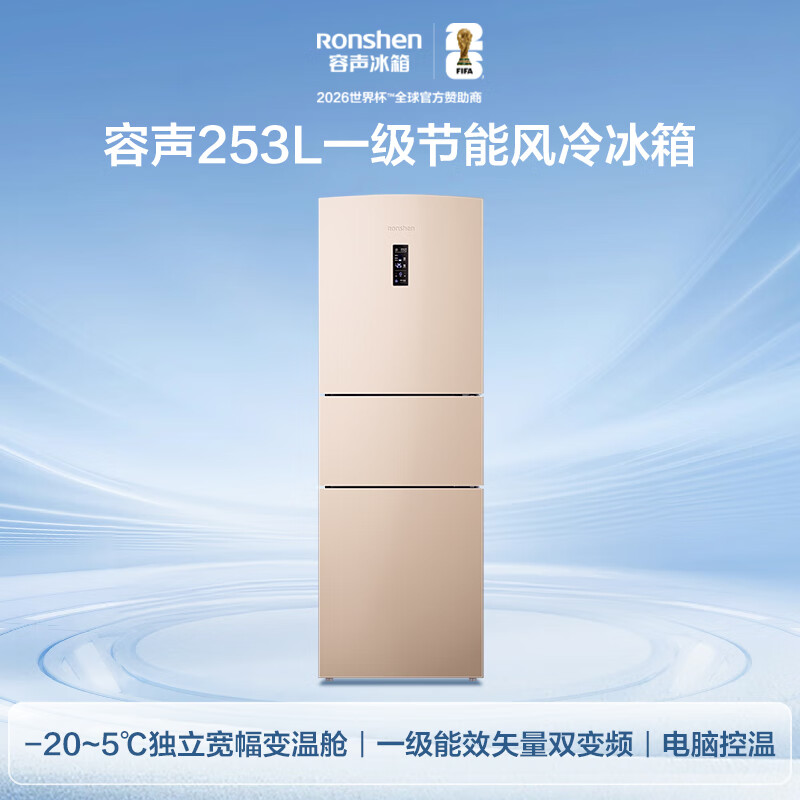 容声253L三开门小冰箱小户型超薄一级能效风冷无霜变频节能家用璀璨金BCD-253WD16NPA BCD-253WD16NPA/台