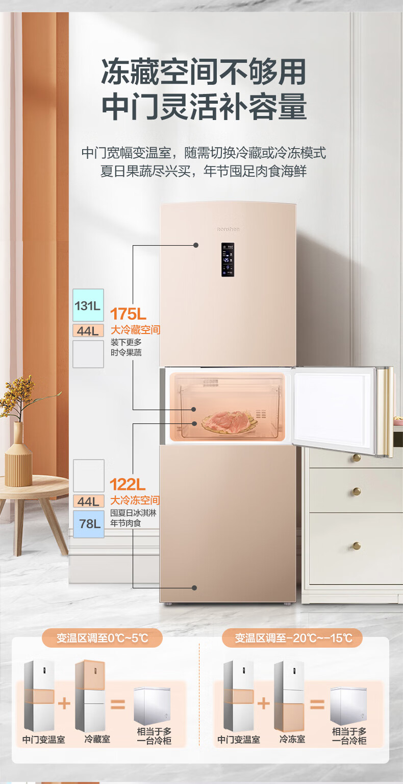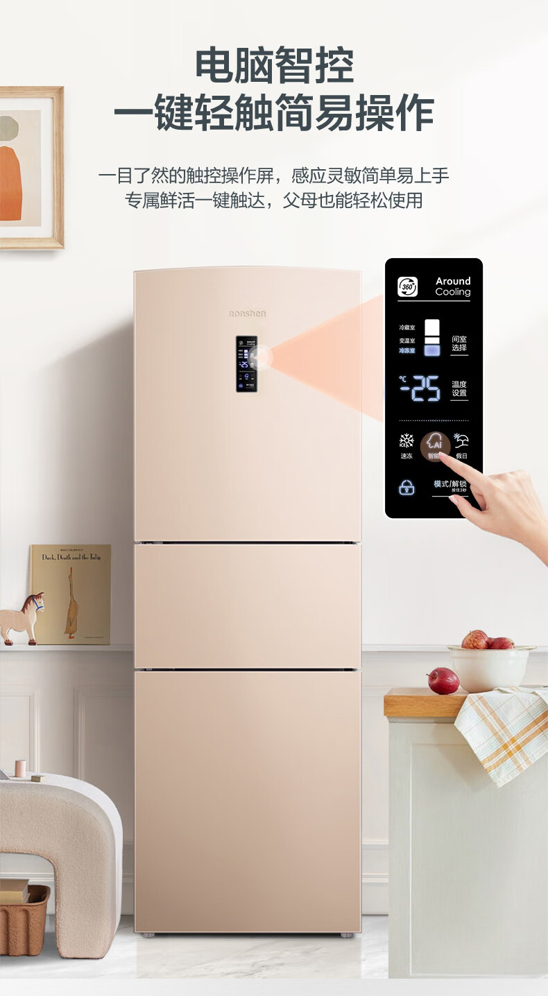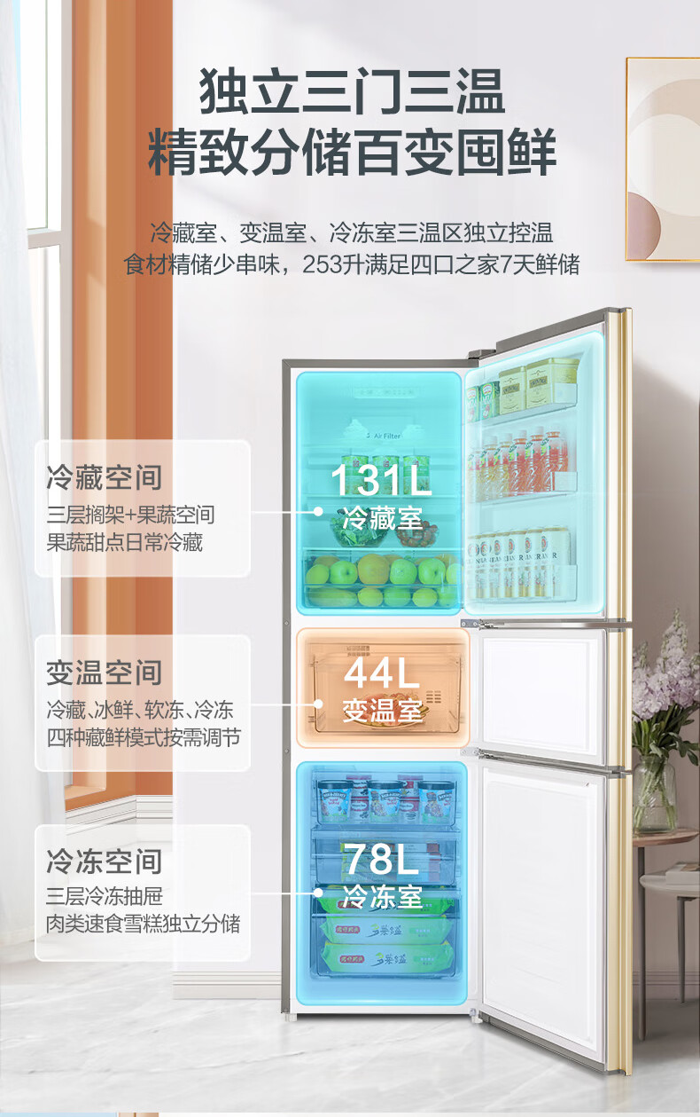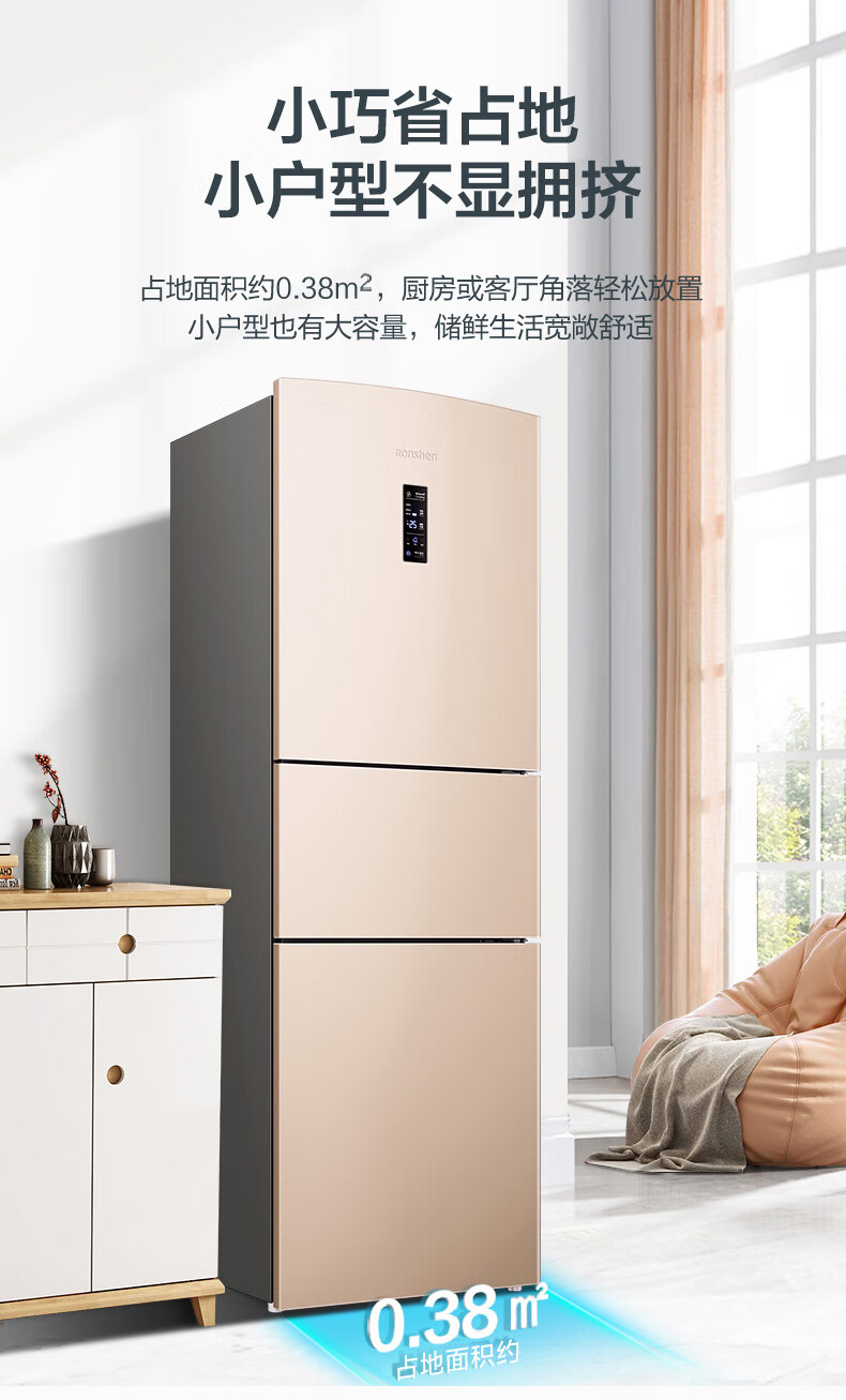• 商品名称:容声253L三开门小冰箱小户型超薄一级能效风冷无霜变频节能家用璀璨金BCD-253WD16NPA BCD-253WD16NPA/台