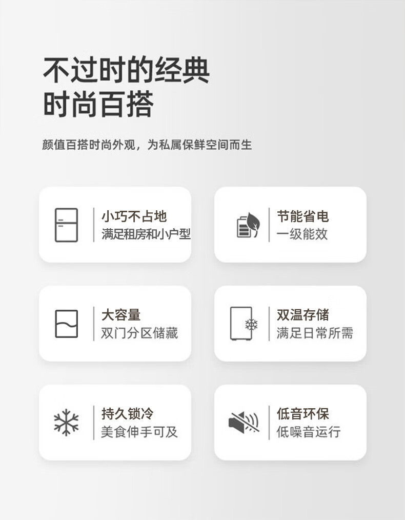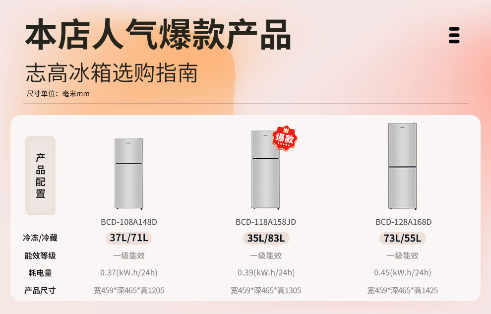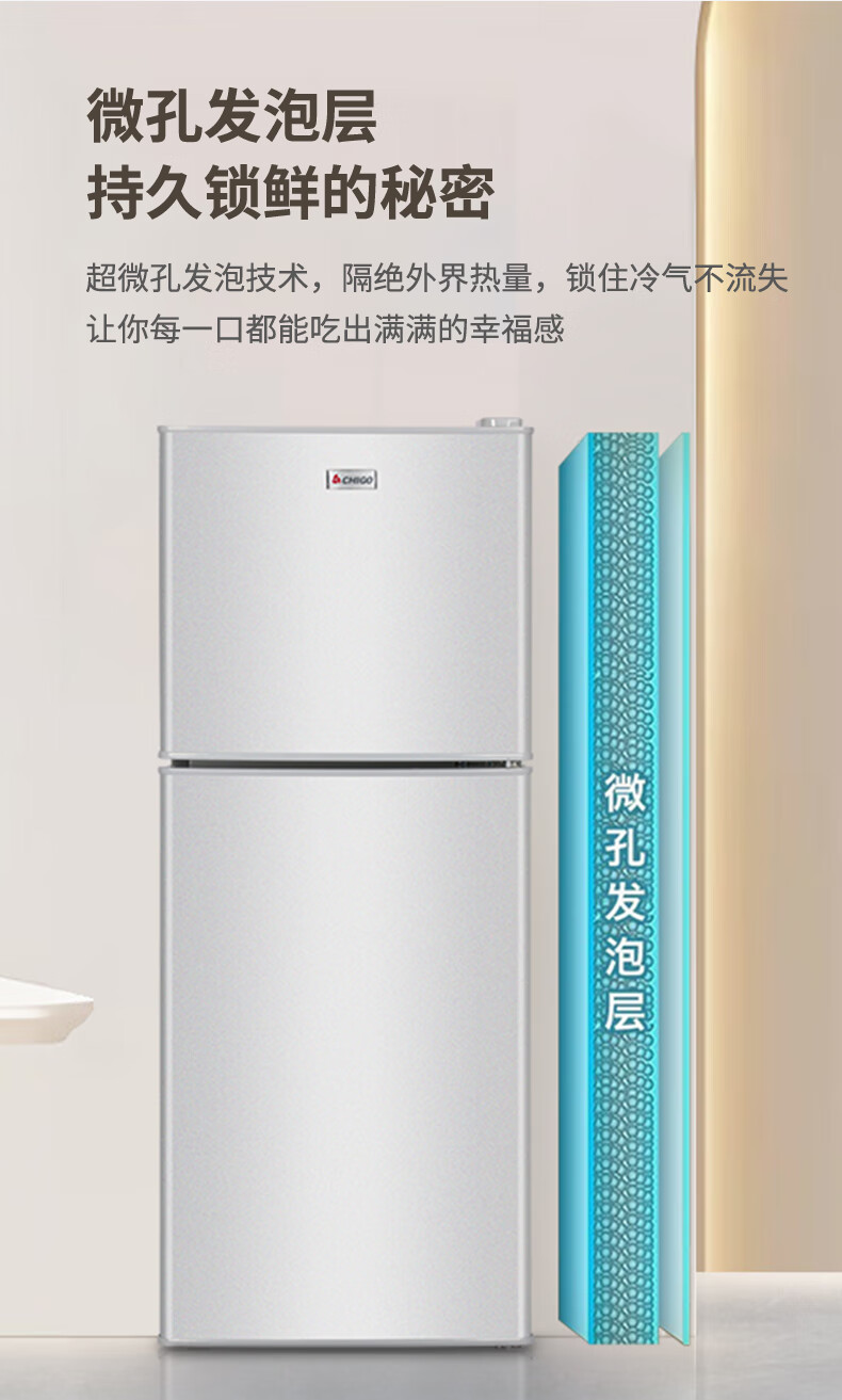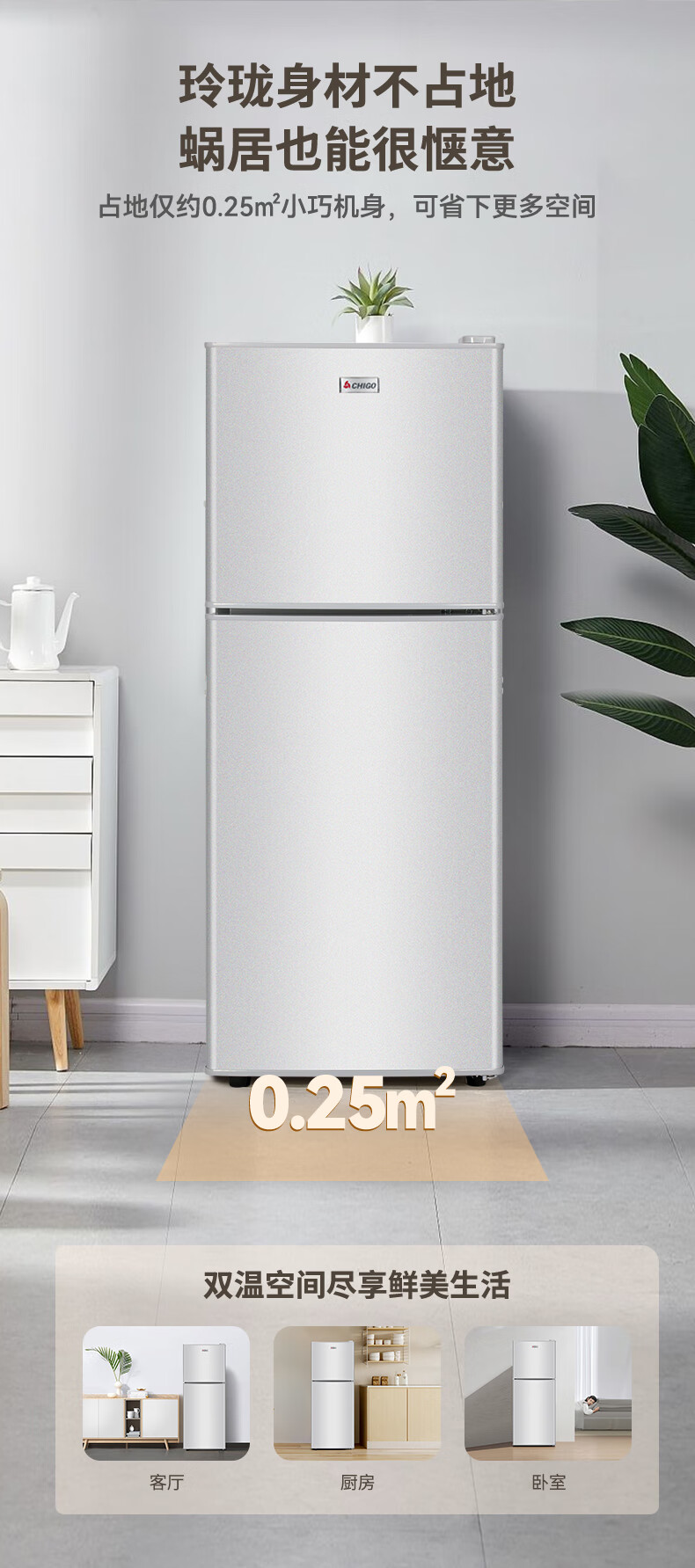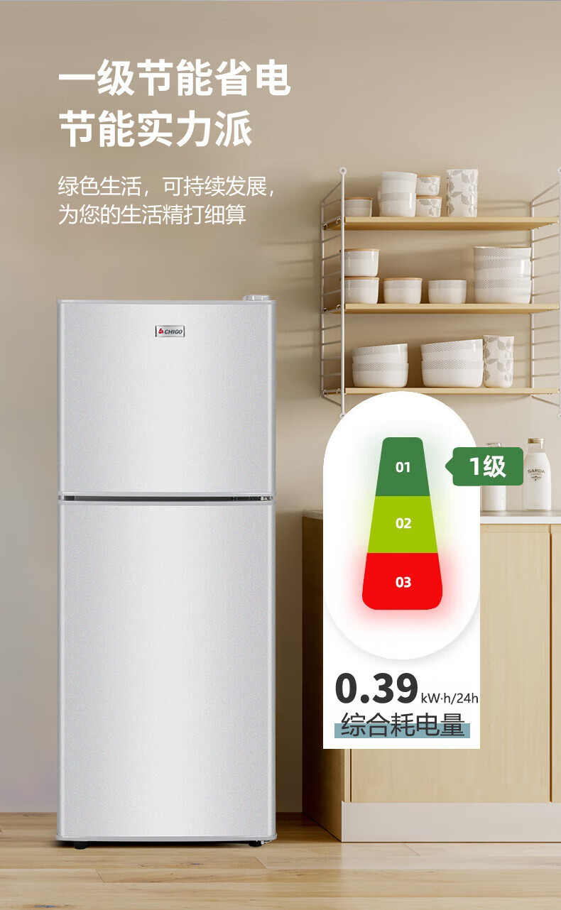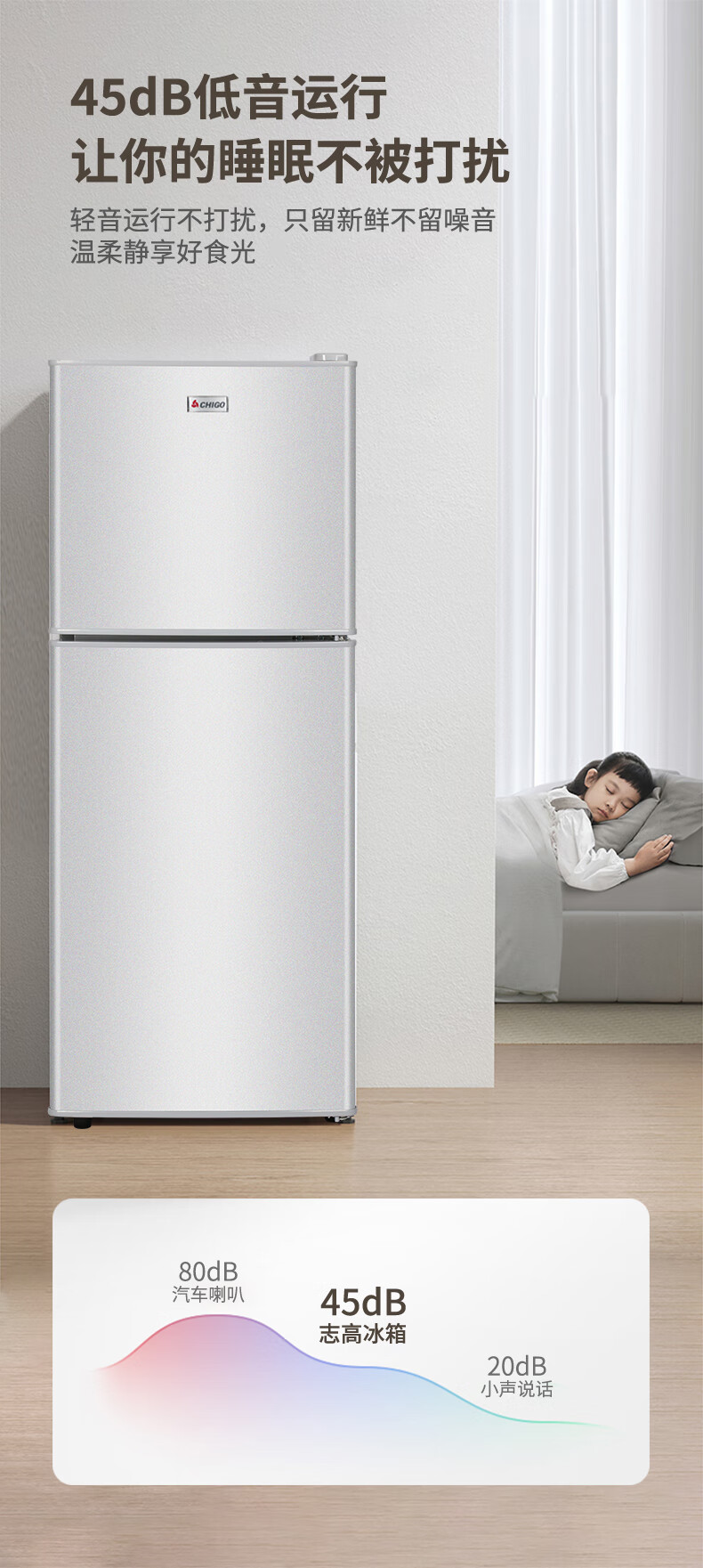 • 商品名称:志高(CHIGO)双门冰箱 118升两门宿舍租房小户型家用冷藏冷冻小冰箱 节能保鲜低噪BCD-118A158JD银色 BCD-118A158JD/台