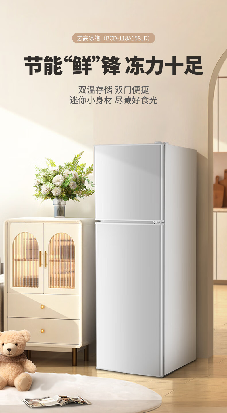 志高(CHIGO)双门冰箱 118升两门宿舍租房小户型家用冷藏冷冻小冰箱 节能保鲜低噪BCD-118A158JD银色 BCD-118A158JD/台