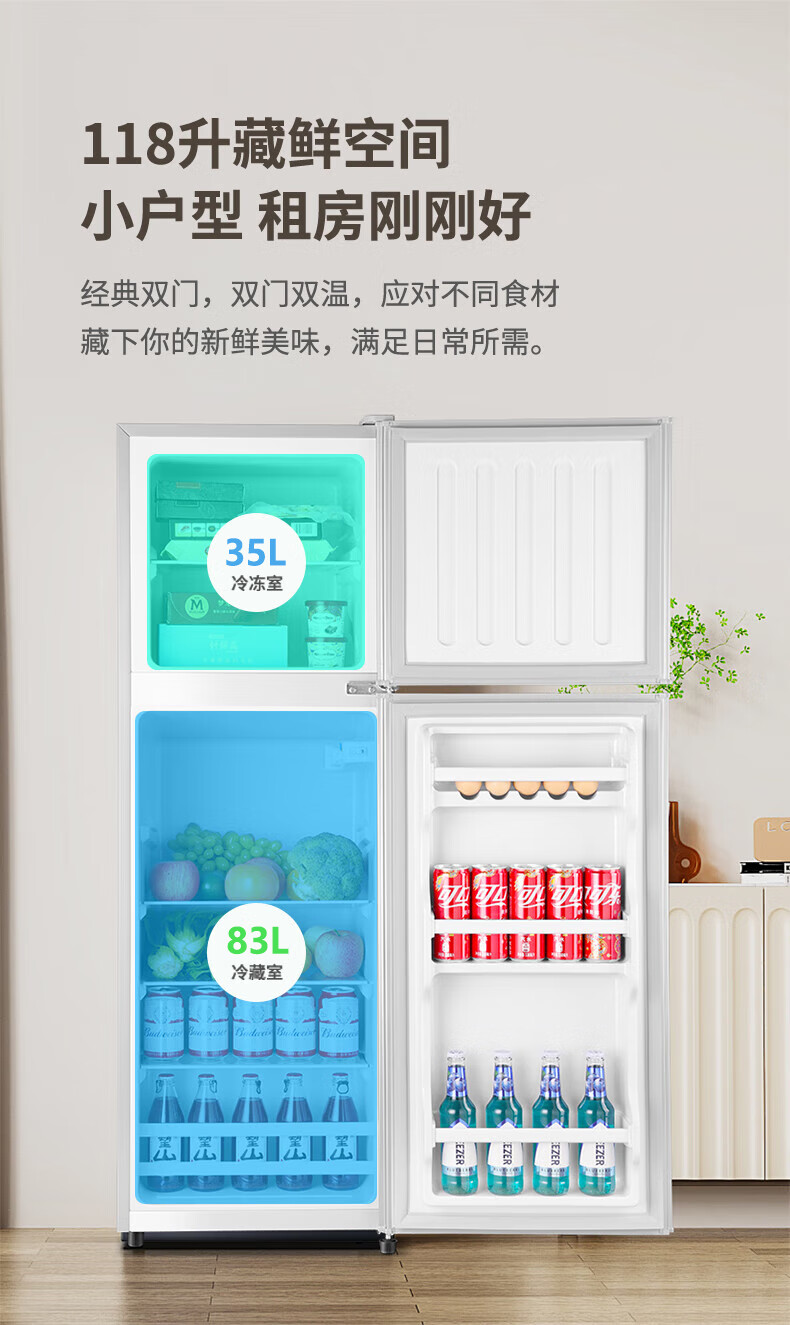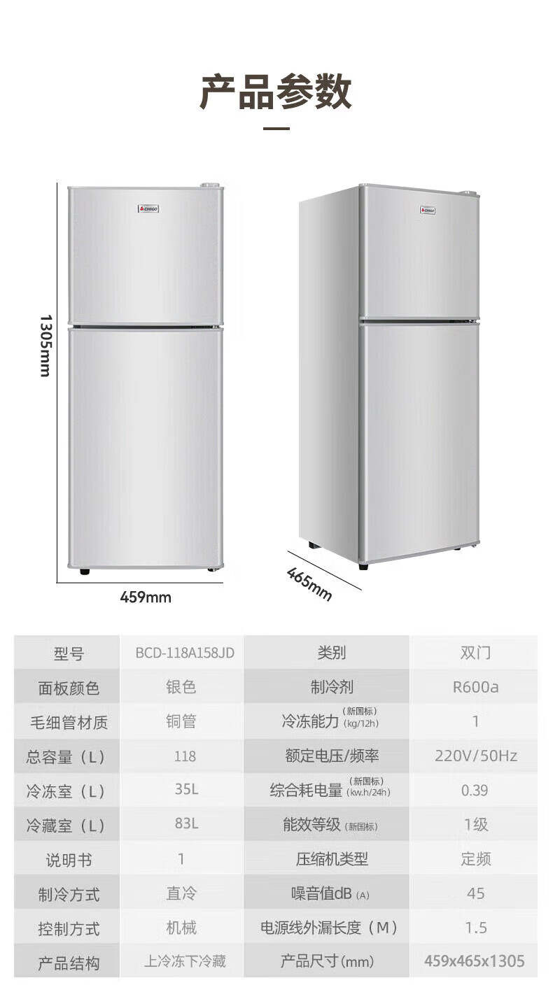 家用电器  > 大家电  > 冰箱  >  志高/CHIGO  >  志高(CHIGO)双门冰箱 118升两门宿舍租房小户型家用冷藏冷冻小冰箱 节能保鲜低噪BCD-118A158JD银色 BCD-118A158JD/台