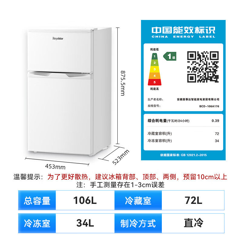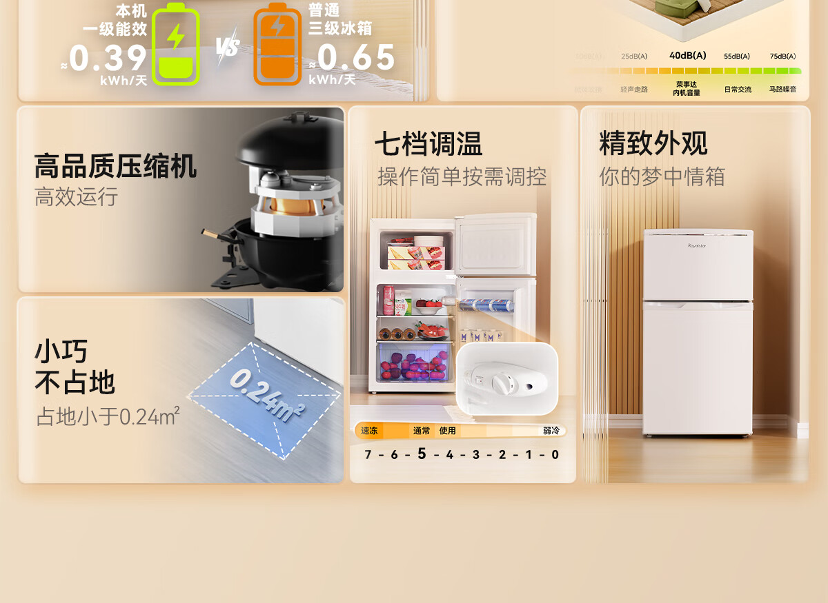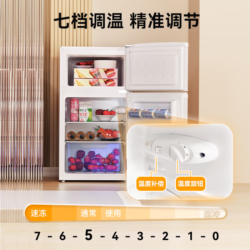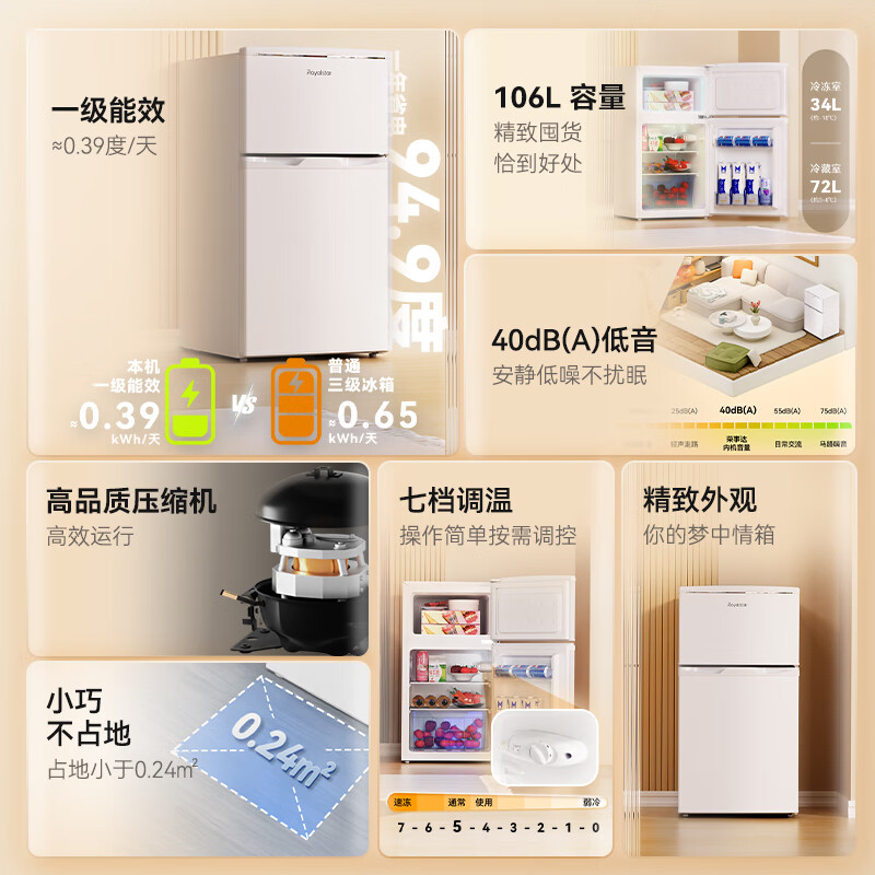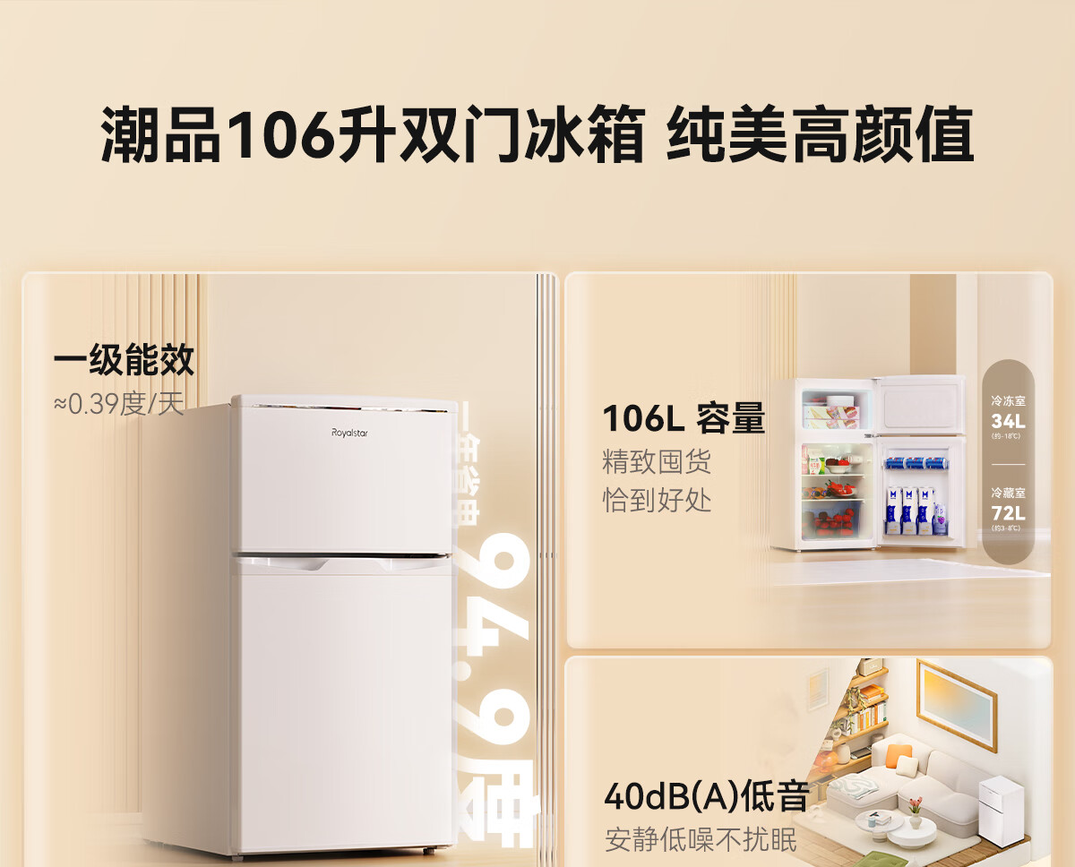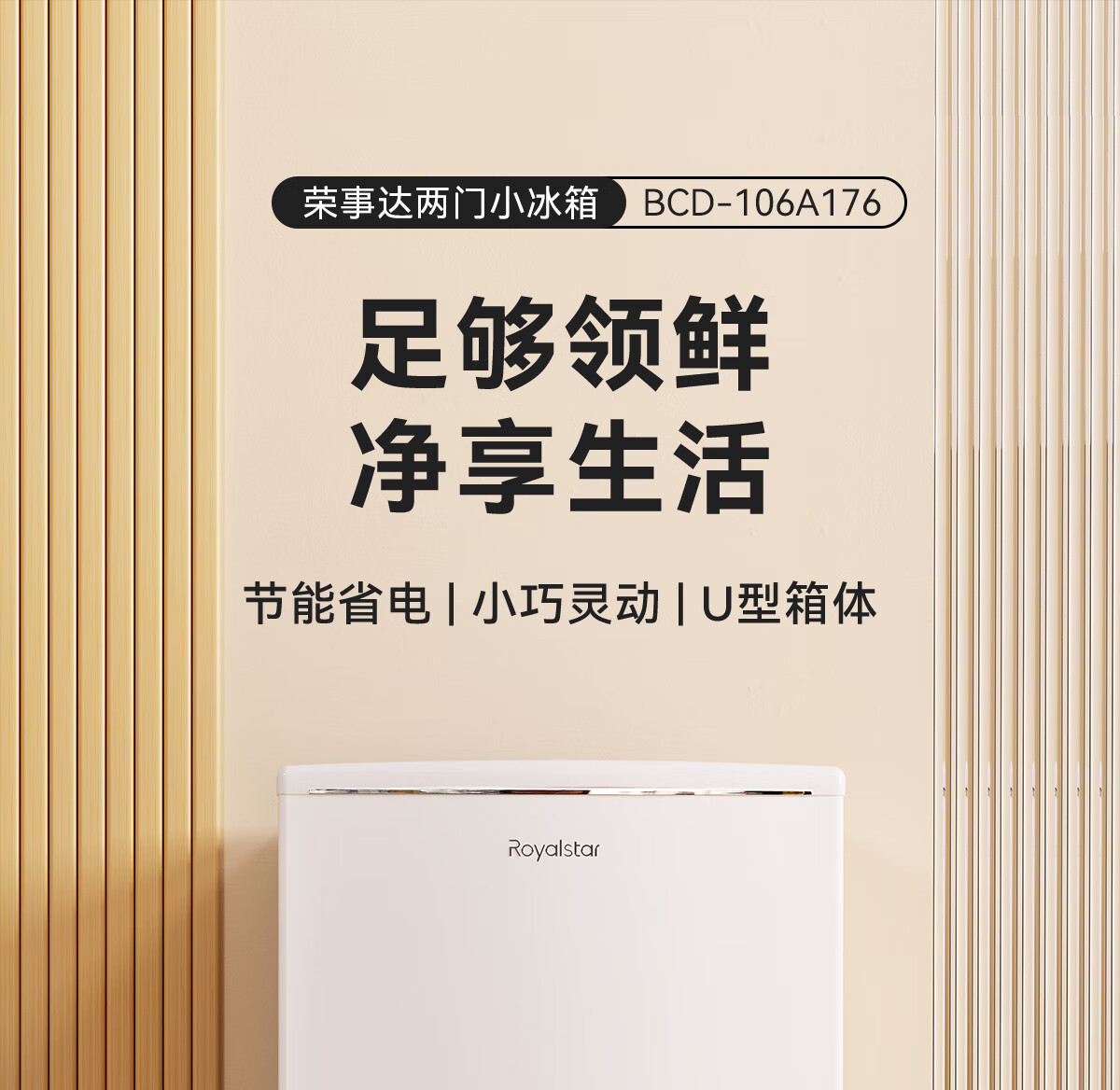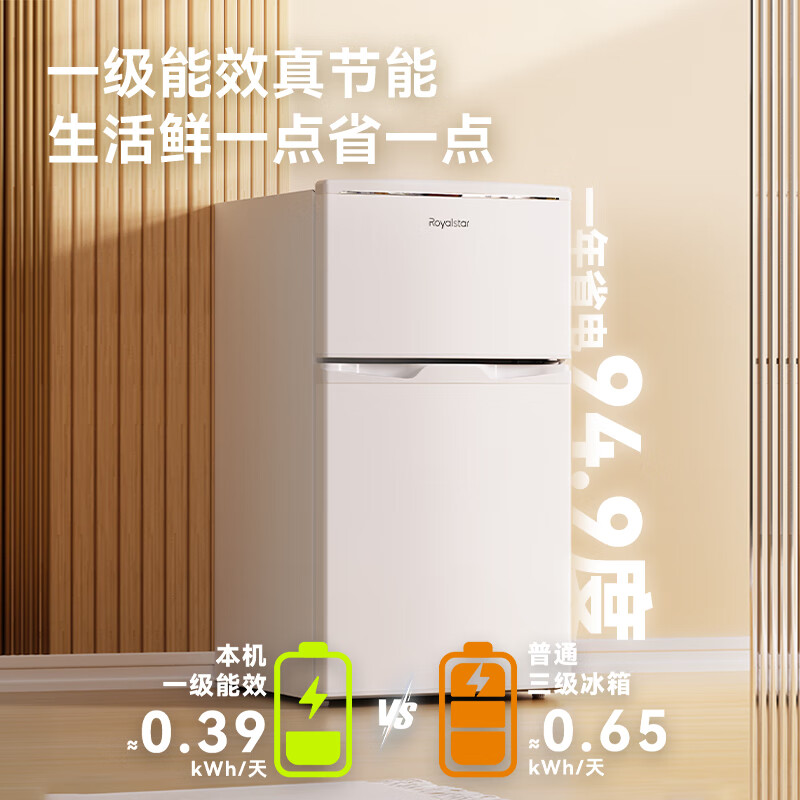 荣事达(Royalstar)106升两门双门二门冰箱节能低音小型家用电冰箱迷你宿舍租房小巧不占地两天仅约一度电BCD-106A176 BCD-106A176/台