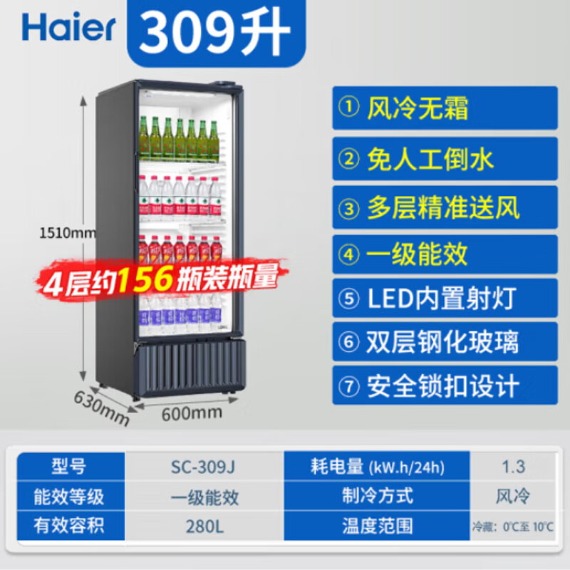 海尔展示柜风冷无霜一级能效商用立式冰柜陈列柜超市便利店饮料冷藏柜玻璃门冰箱透明保鲜柜SC-309J SC-309J/台