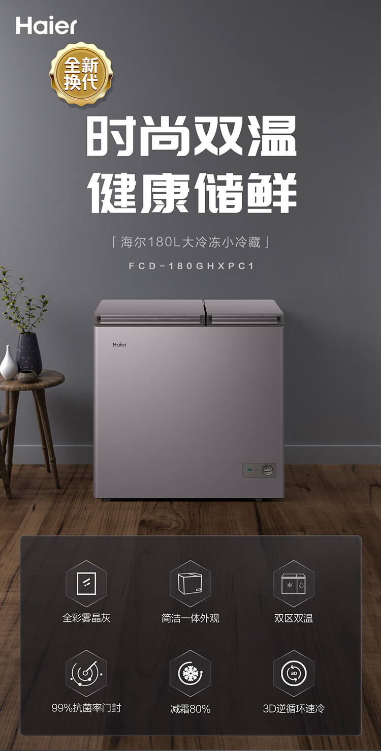 海尔(Haier)FCD-180GHXPC1 180L大冷冻小冷藏双区双温冷柜 一级能效节能 制冷均匀 冷冻減霜80% FCD-180GHXPC1/台