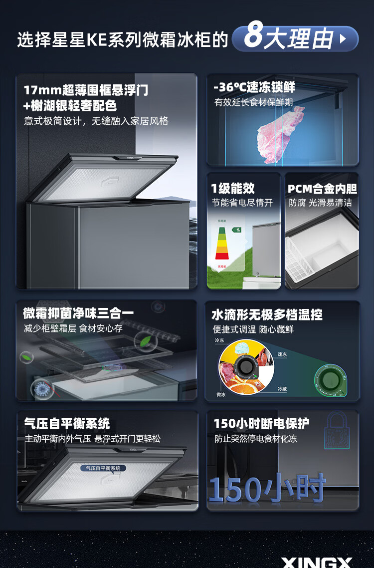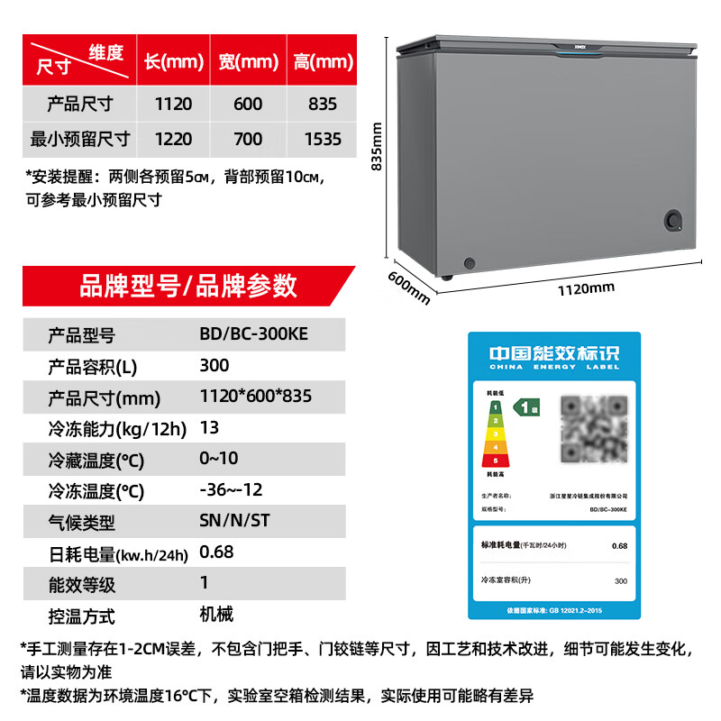 • 商品名称:星星(XINGX)300L单温家用小型冰柜 大容量减霜保鲜净味节能一级能效冰箱冷藏冷冻两用冷柜BD/BC-300KE BD/BC-300KE/台