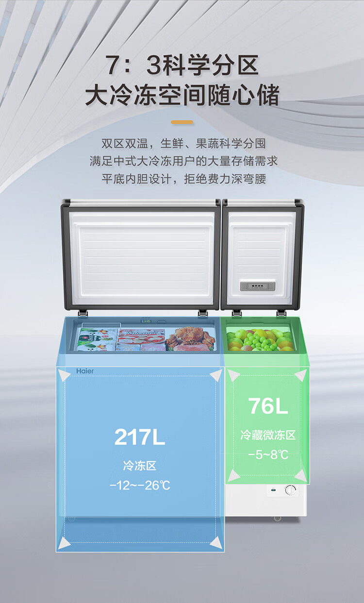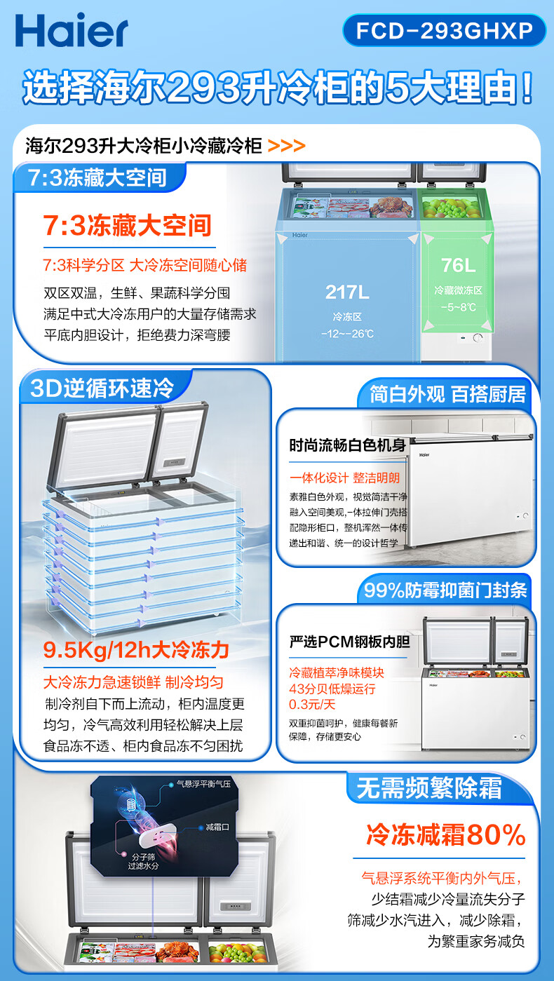 家用电器  > 大家电  > 冷柜  >  海尔/Haier  >  海尔(Haier)293升双温家用冰柜冷藏冷冻两用保鲜大容量双箱无需频繁除霜300升以内冰箱FCD-293GHXP FCD-293GHXP/台