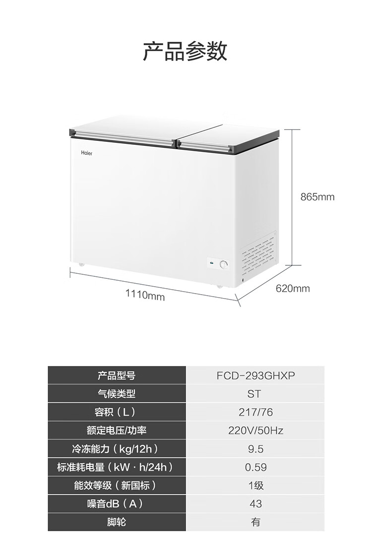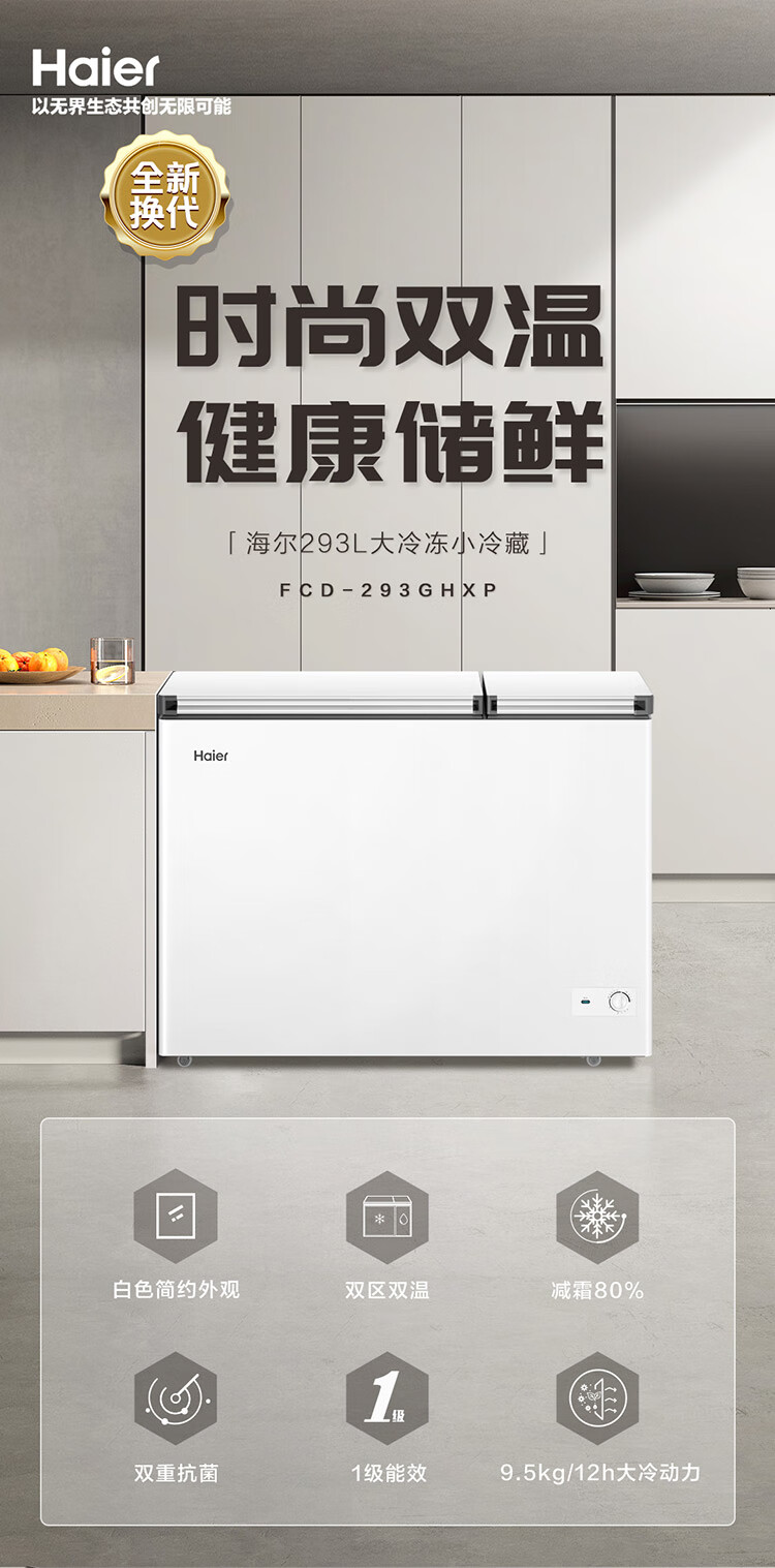 • 商品名称:海尔(Haier)293升双温家用冰柜冷藏冷冻两用保鲜大容量双箱无需频繁除霜300升以内冰箱FCD-293GHXP FCD-293GHXP/台