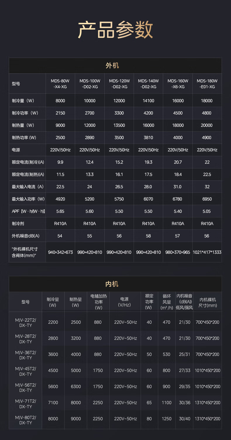 包装清单: 室外机× 1、室内机× 4、说明书 × 1、保修卡 × 1、 因多联机内外机大小差异,产品参数会有所浮动,已发货实物为准