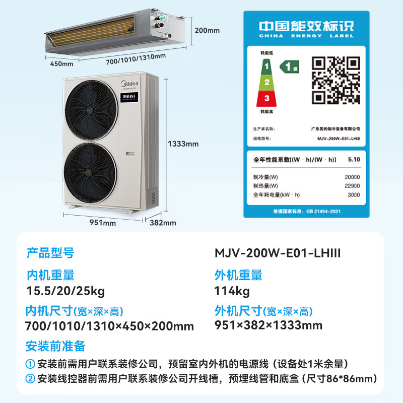 商品名称: 美的(Midea)中央空调小多联机领航者三代大7匹一拖五四室一厅新一级能效MJV-200W-E01-LHⅢ适用120~160㎡ MJV-200W-E01-LHⅢ/套