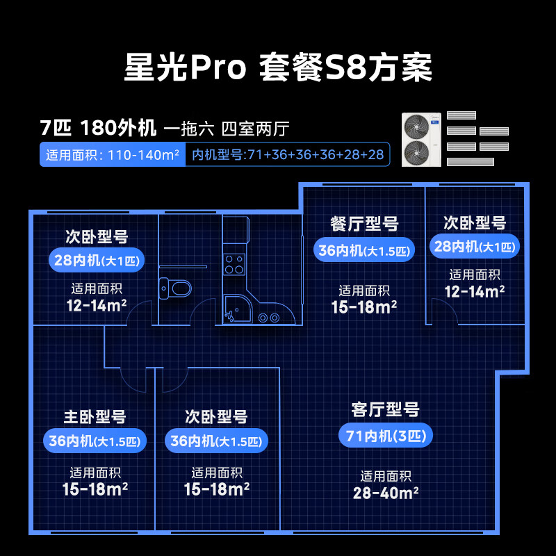 商品名称: 美的中央空调一拖六多联机7匹星光PRO25年 省电双风轮 适用140~160㎡ MDS-180W-E01-XGpro(GNX)/套