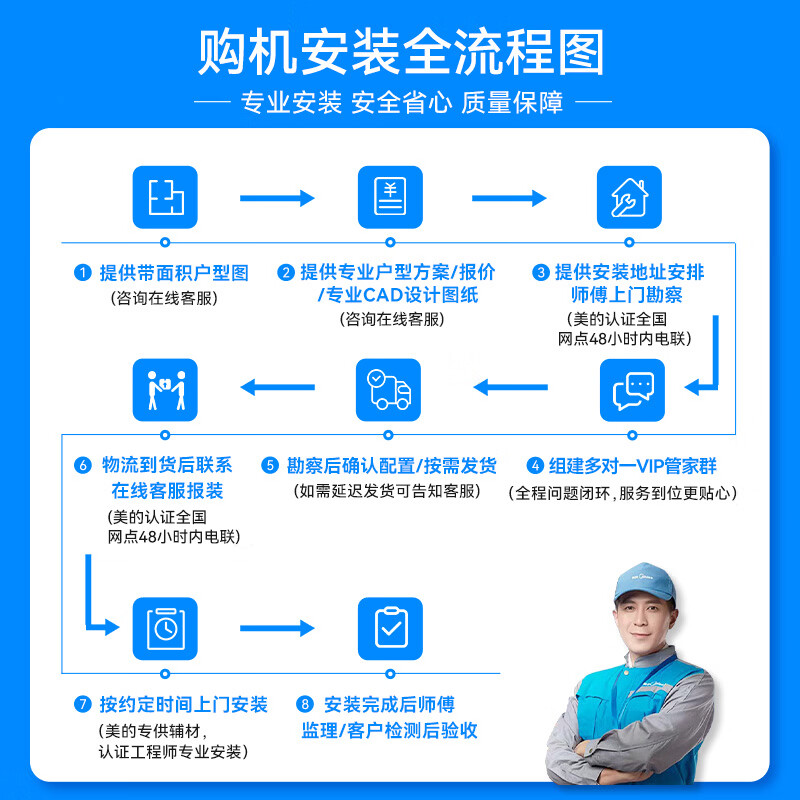包装清单: 室外机安装说明书*1,室外机、室内使用说明书*1,美的中央空调用户服务指南*1,竣工报告书*1,外机*1,内机*4,出水管接管*1,wifi线控器*4。(因多联机内外机大小差异,产品参数会有所浮动,以发货实物为准)