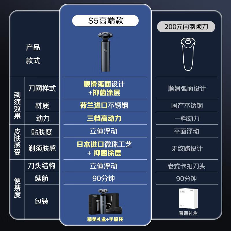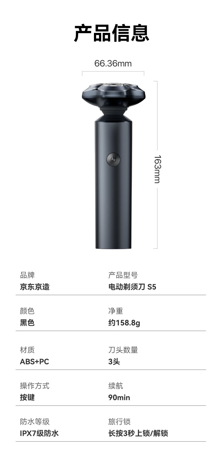 商品名称: 京东京造电动剃须刀礼盒款S5 电动剃须刀旋转式男士刮胡须刀刮胡刀双环弧面刀网浮动贴面水洗男士 S5/个