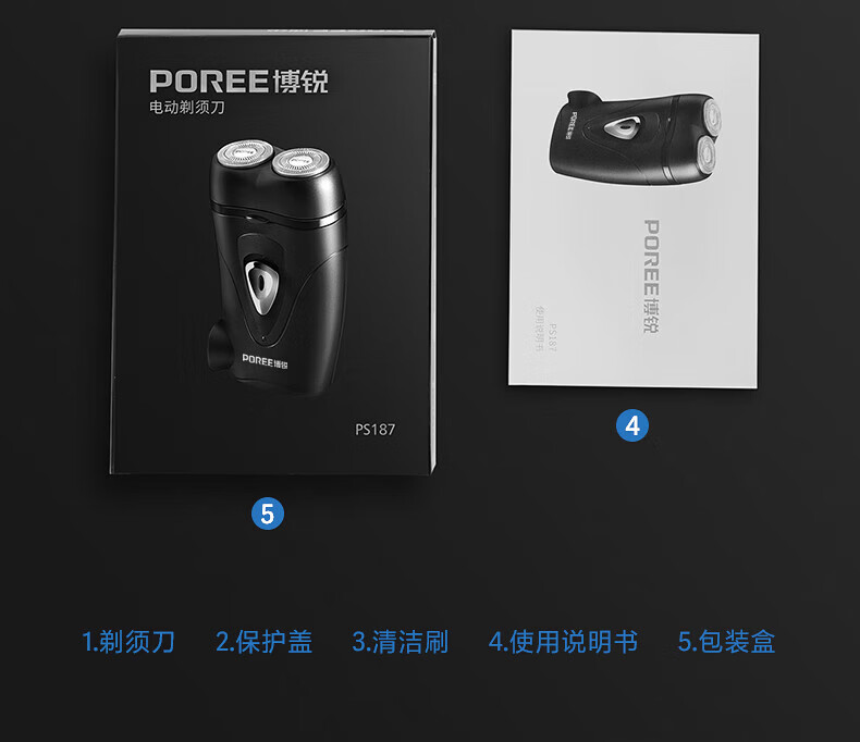 包装清单: 刀头防尘盖、清洁刷、说明书、PS187剃须刀