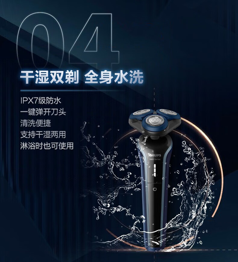 商品名称: 飞利浦(PHILIPS)剃须刀电动刮胡刀电动剃须刀全新3系全身水洗干湿双剃胡须刀敏感肌适用S3608 S3608/个