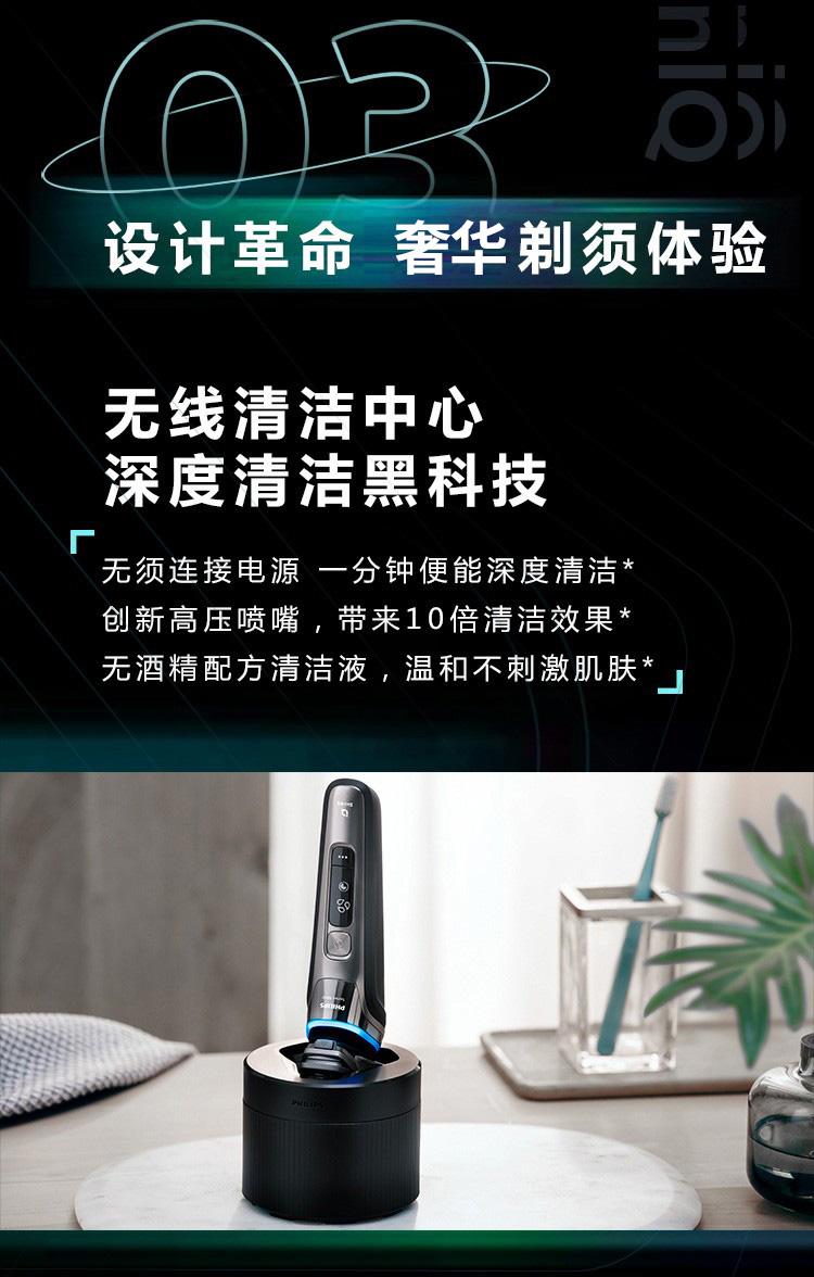 包装清单: 剃须刀,旅行包,充电底座,无线清洁舱