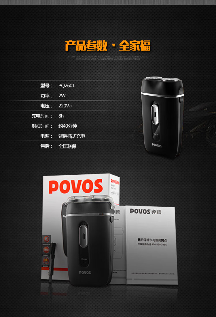 家用电器  > 个护健康  > 剃须刀  >  奔腾/BNTN  >  奔腾(POVOS)电动剃须刀男士胡须刀PQ2601节日礼物工会福利 黑色 普通装 PQ2601/个
