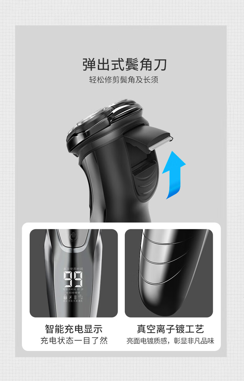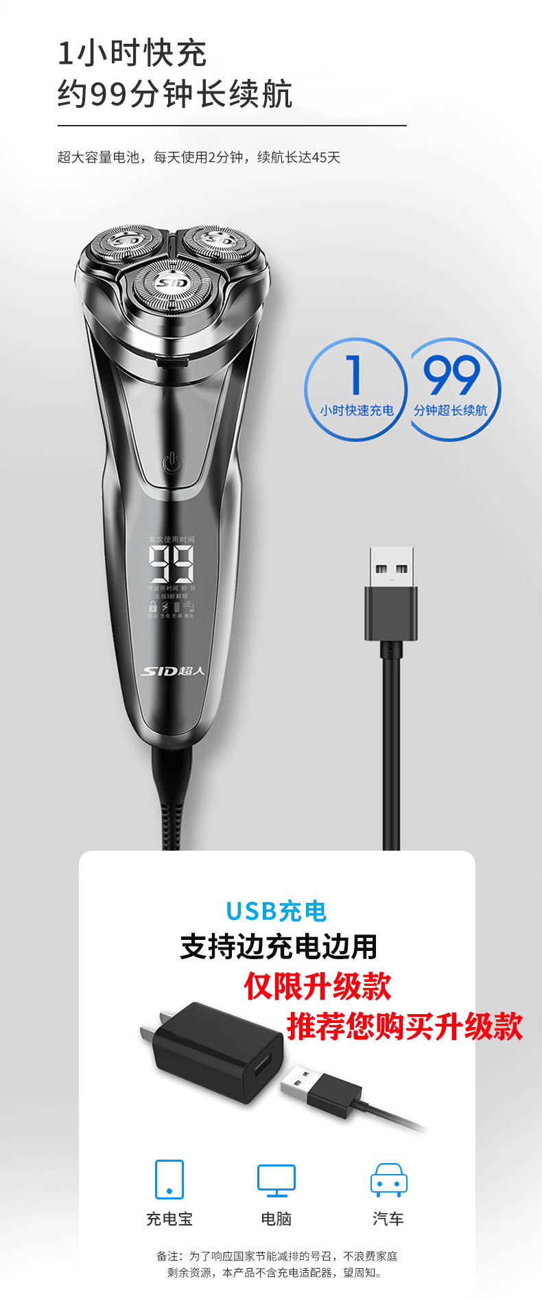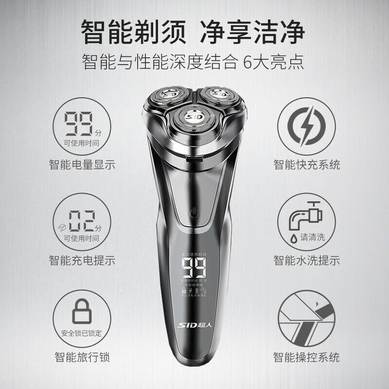 • 商品名称:超人(SID) 剃须刀电动刮胡刀剃胡刀男士便携电须刀刮胡子全身水洗RS7350枪色 豪华数显款 RS7350/个