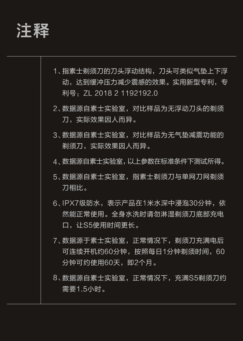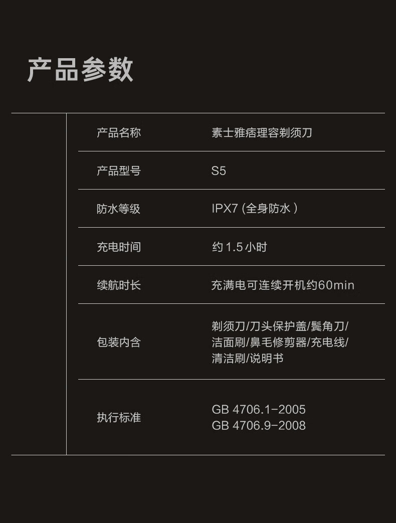 包装清单: S5主机、保护盖、鬓角刀、洁面刷、鼻毛剪、充电线、说明书